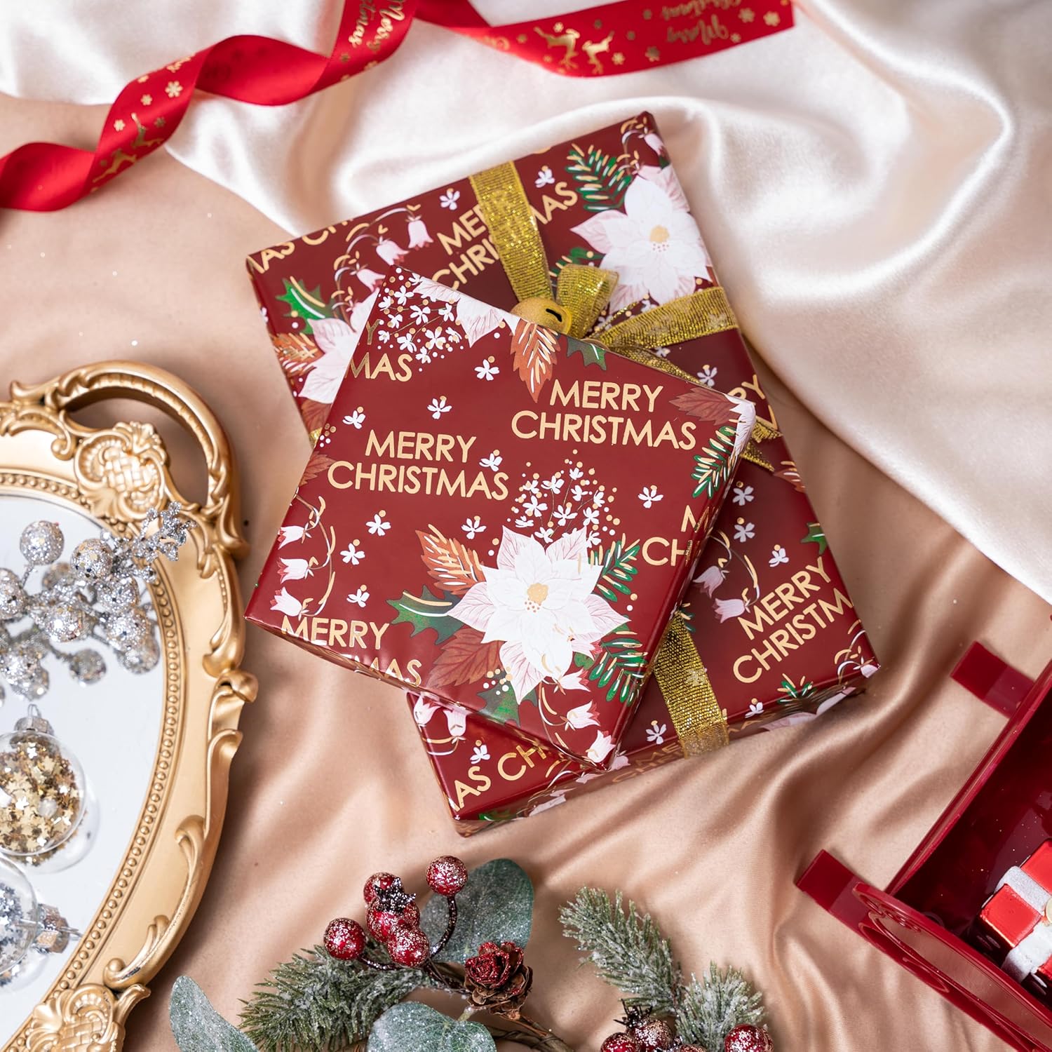 LeZakaa Christmas Wrapping Paper Roll - Red Flower & Merry Christmas Gold Foil Pattern for Holiday, Party - 17 inches x 32.8 Feet (46.45 sq.ft.)