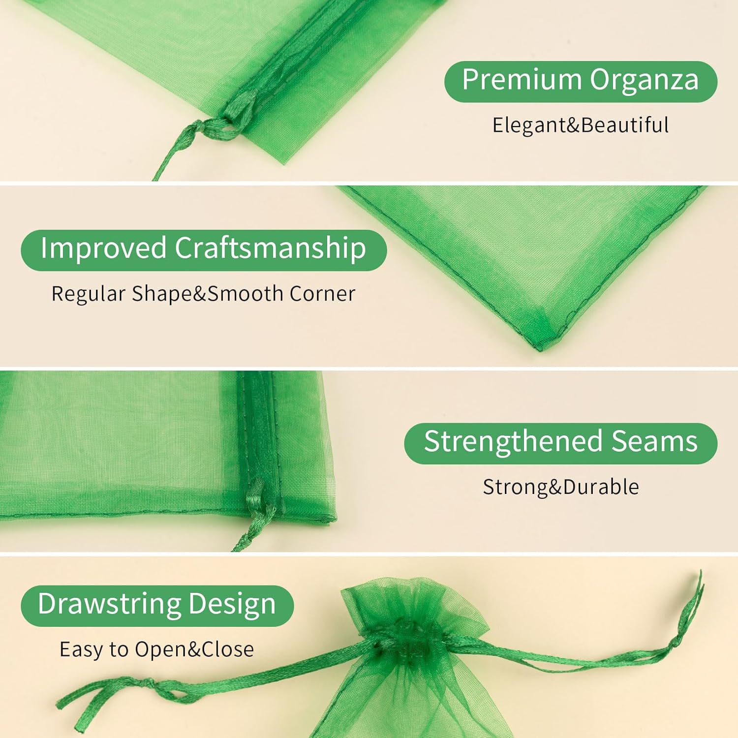 - Package Details: Package comes in 50 pcs green organza bags, with a size of 3x4 inch, offering a practical and stylish solution for organizing and presenting small items.