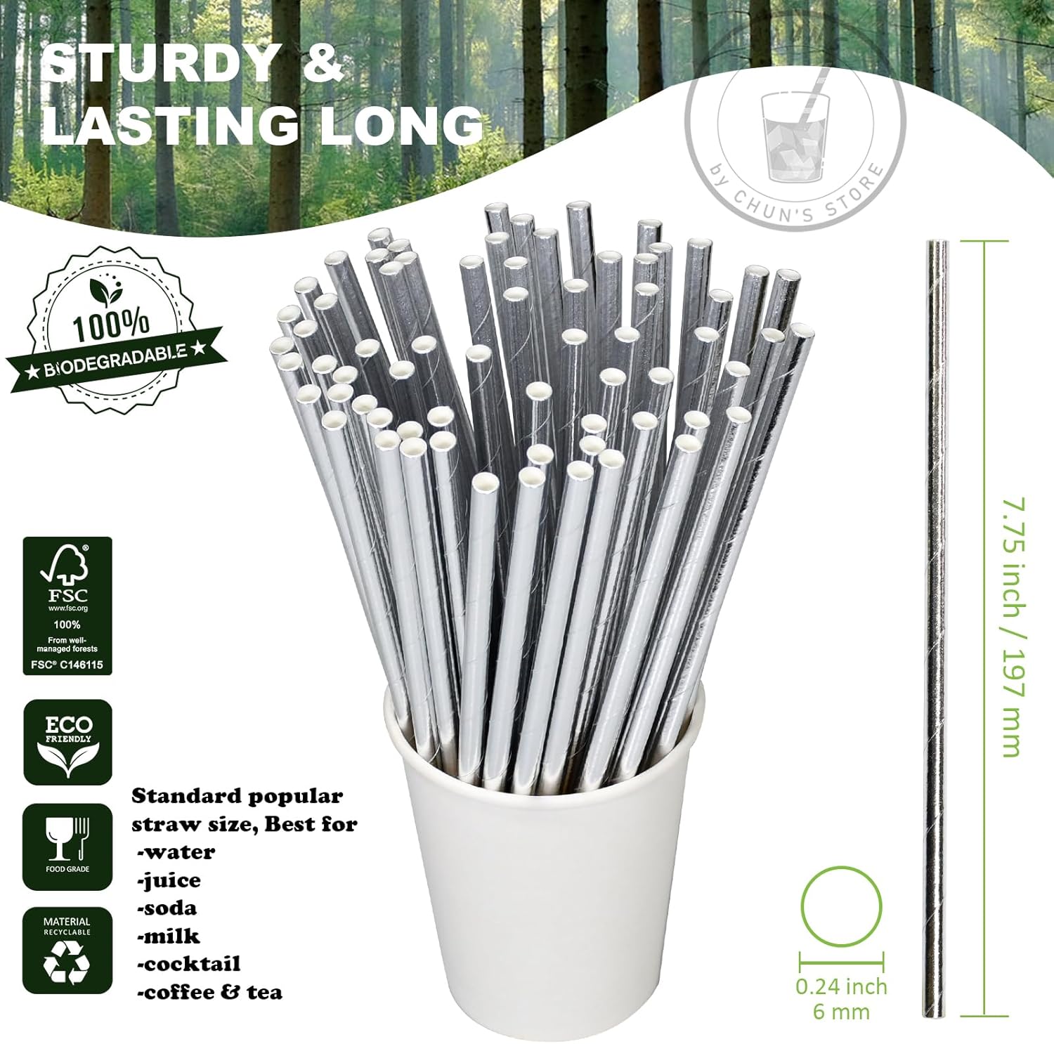 - Made from food grade paper, glue and ink. The paper of our straws are made from wood pulp originated from well-managed forest (FSC No.C146115)