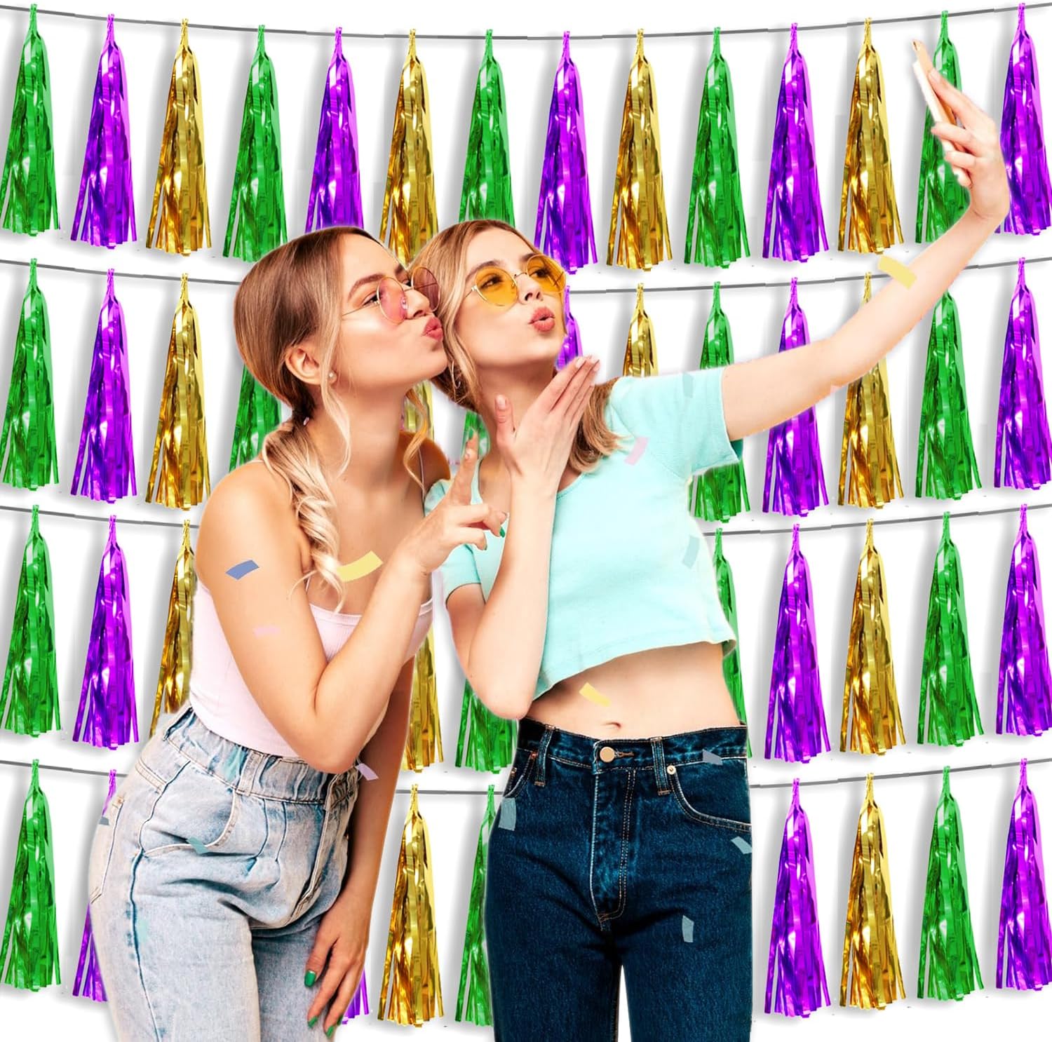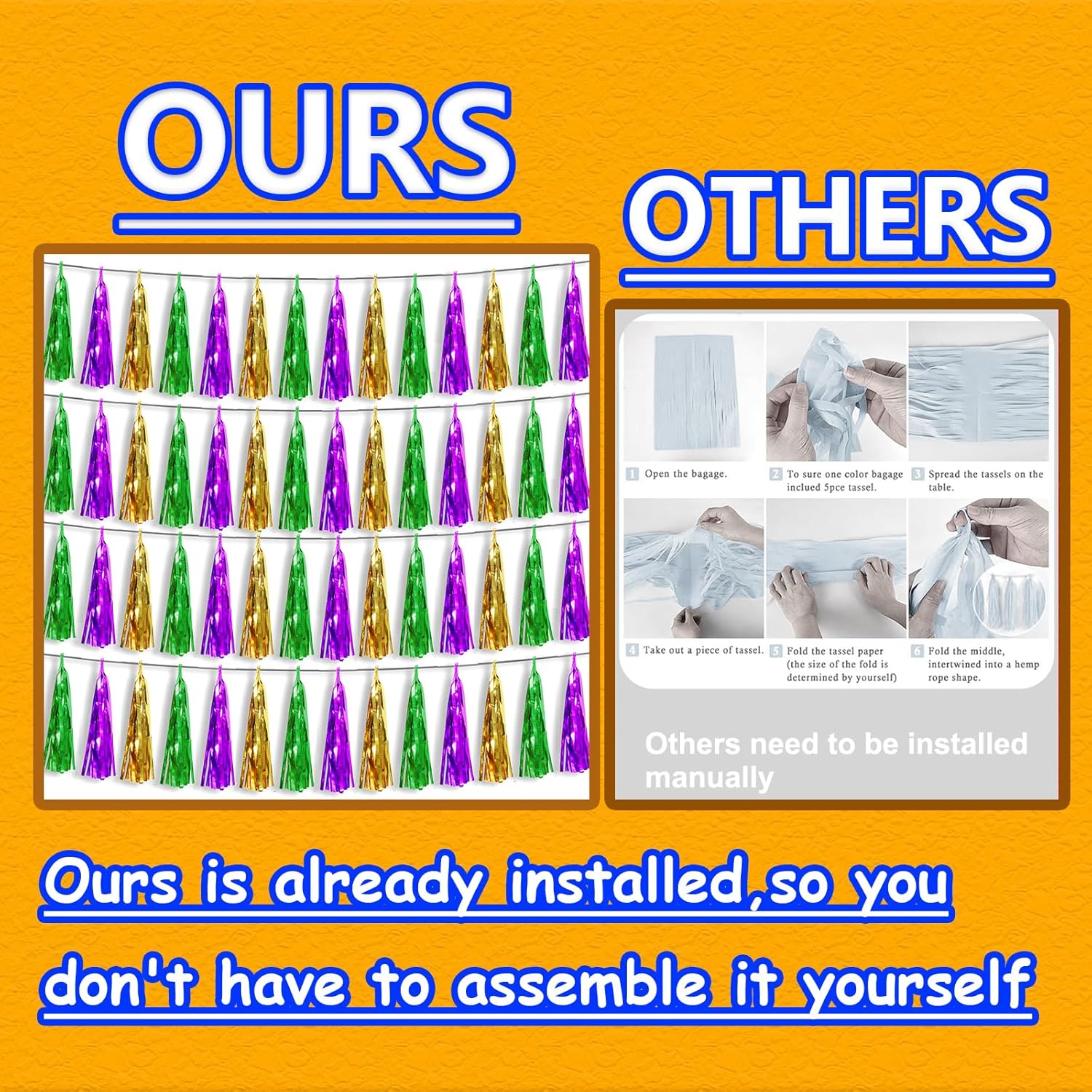 - 【Package Includes】The total length of the gold green purple gold birthday tassels banner is 40 feet, divided into 4 strips, each 10 feet long. Each banner contains 15 tassels, and each tassel measures 14 inches, for birthday decorations many occasions uitable for Patriotic display, Homecoming Float, Christmas Float, ecorative metal trailers, graduation floats etc