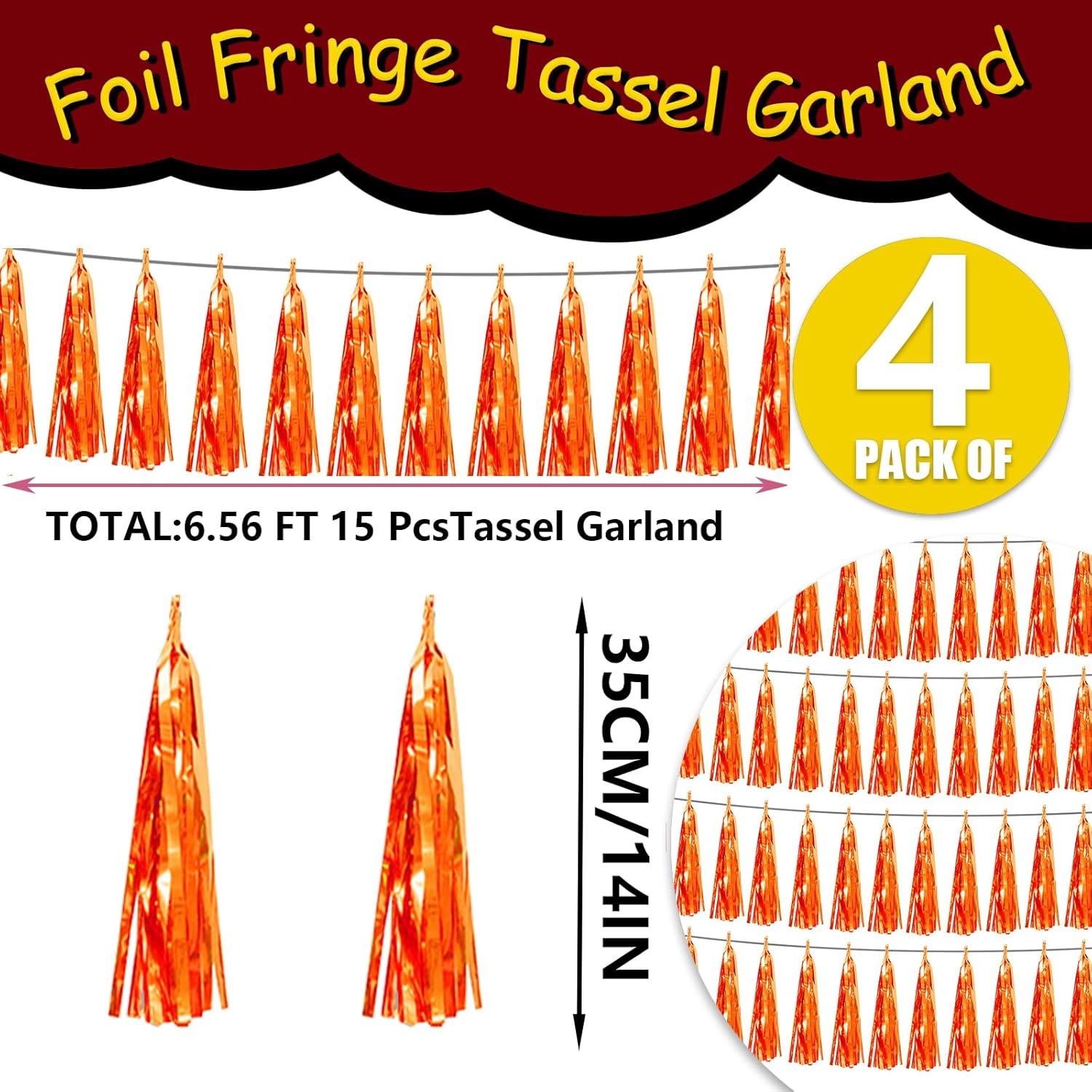 4P Orange Foil Fringe Tassel Banner Garland Metallic Tinsel Streamers Wall Hanging Curtain Backdrop Banner for Parade Floats, Graduation Decorations, Father's Day, Fall, Thanksgiving Party Decoration