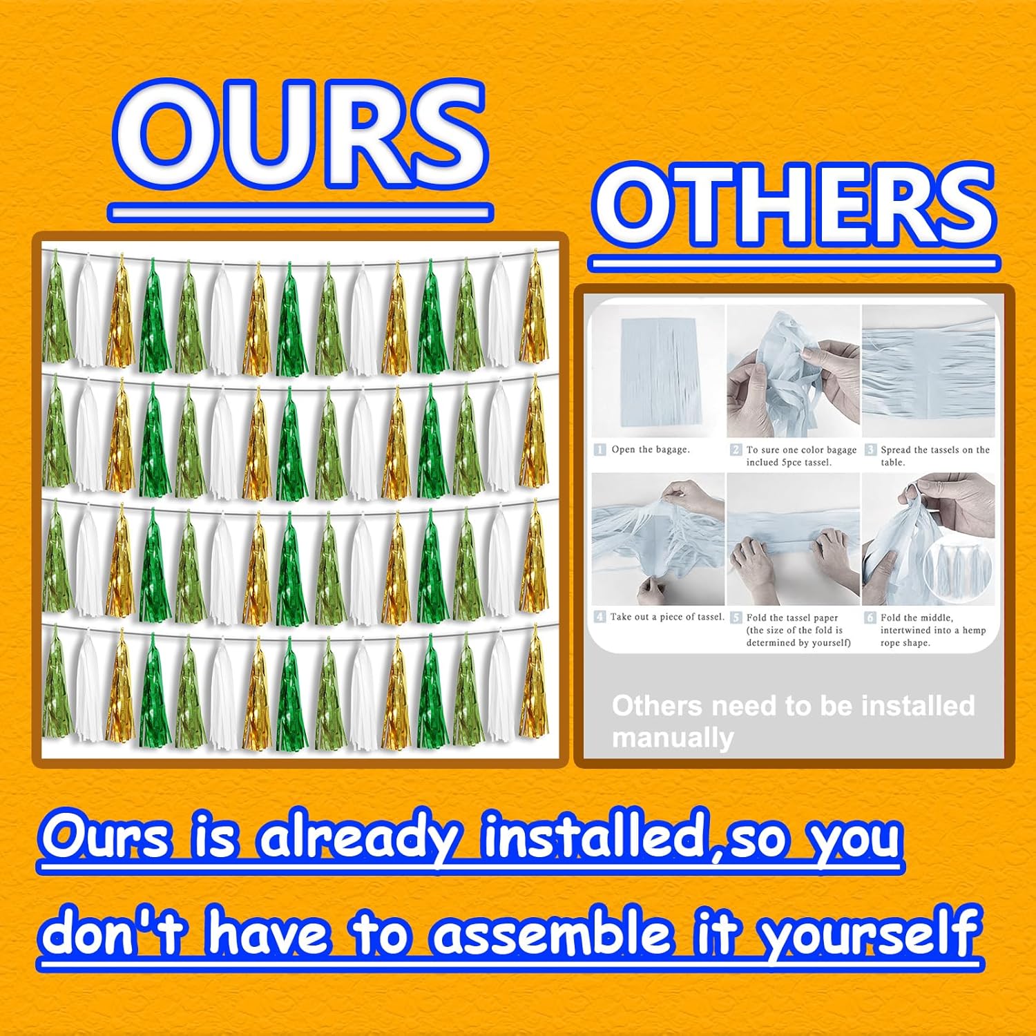 - 【Premium Reusable Tassel Material】: Our glitter fringe garland is made of high-quality PET material, with the virtue of nice craftsmanship and light weight which is safe and recyclable. And the smooth touch makes tassels easy to tidy up. They come with white ribbon for hanging, and garland tassels hang perpendicular to the string, and are adjustable to provide you with the option of spreading the tassels out or piecing them closer together.