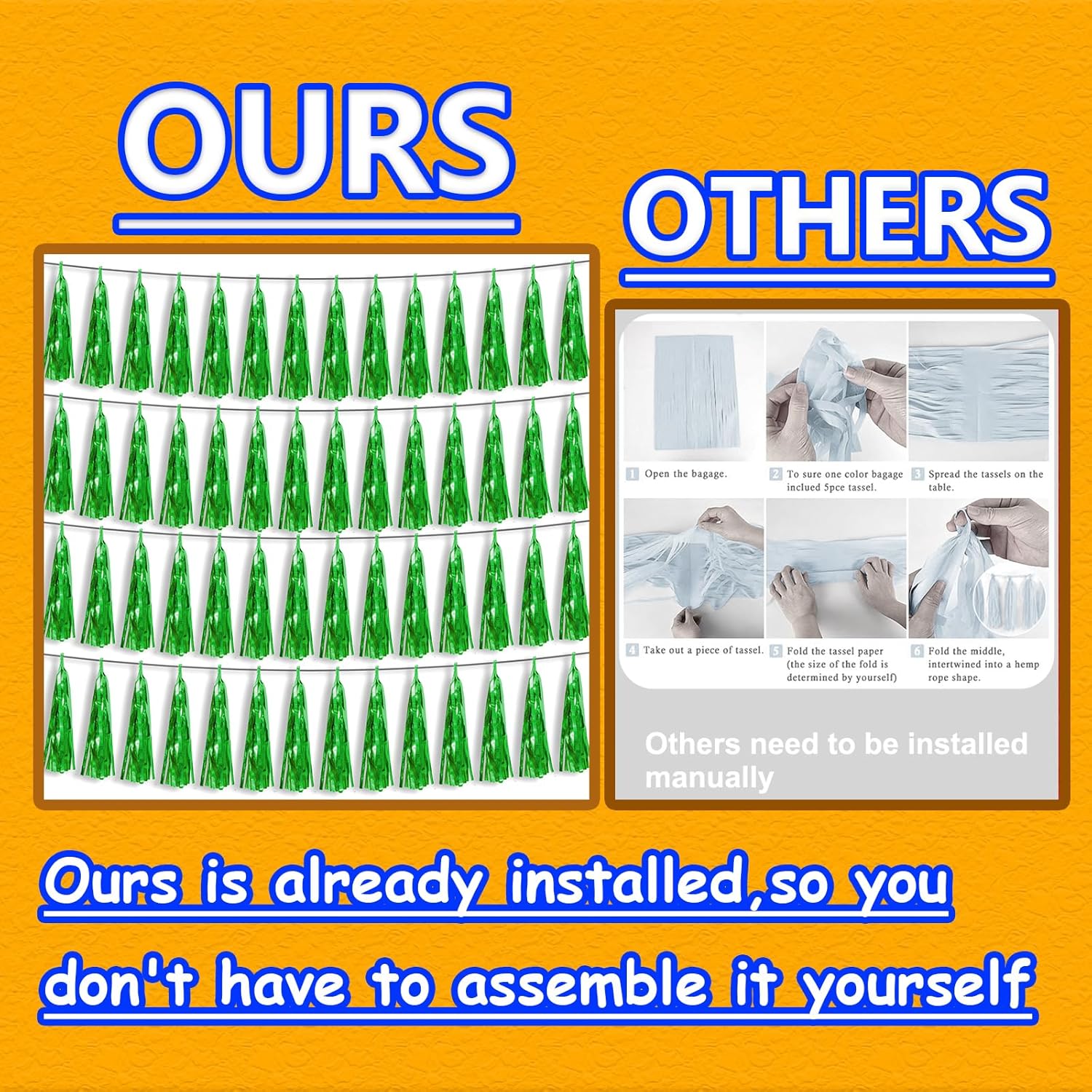 - 【Premium Reusable Tassel Material】: Our glitter fringe garland is made of high-quality PET material, with the virtue of nice craftsmanship and light weight which is safe and recyclable. And the smooth touch makes tassels easy to tidy up. They come with white ribbon for hanging, and garland tassels hang perpendicular to the string, and are adjustable to provide you with the option of spreading the tassels out or piecing them closer together.
