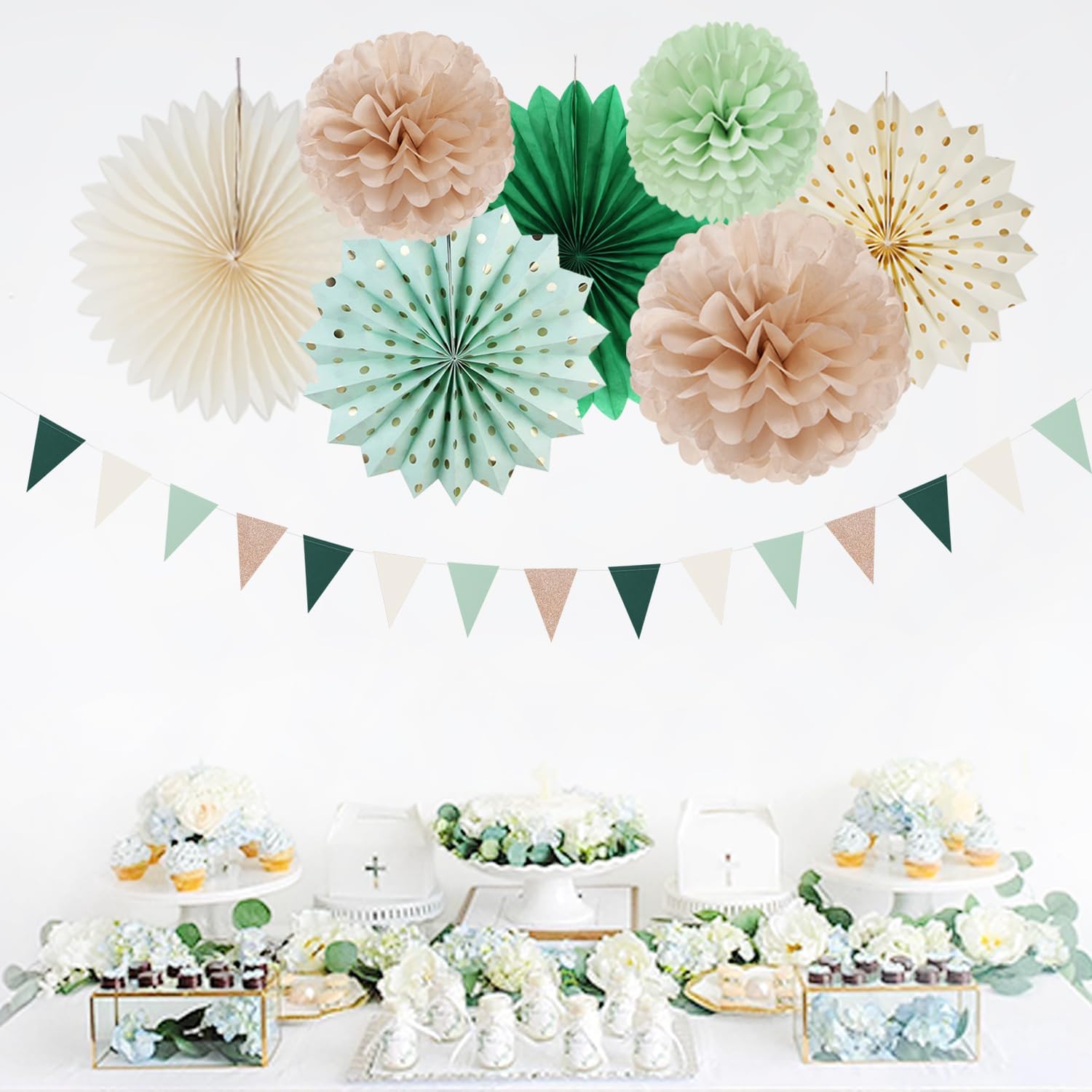 - [Package Includes] Olive-sage green champagne gold pink party decorations kit contains: 1 x triangle bunting, 4 x paper fans, 9 x tissue pom poms, 2 x honeycomb balls, 4 x paper lanterns, a total of 20 pieces of various sizes of decorations. Better embellish your party.