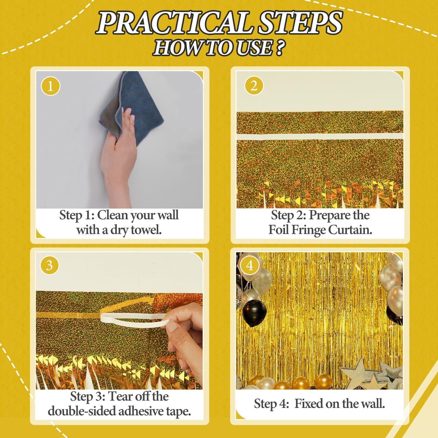 - 【Easy and Convenient Installation】These foil fringe curtains are easy to install and can be quickly hung on smooth surfaces using the included double-sided adhesive tape. No extra tools or materials required.