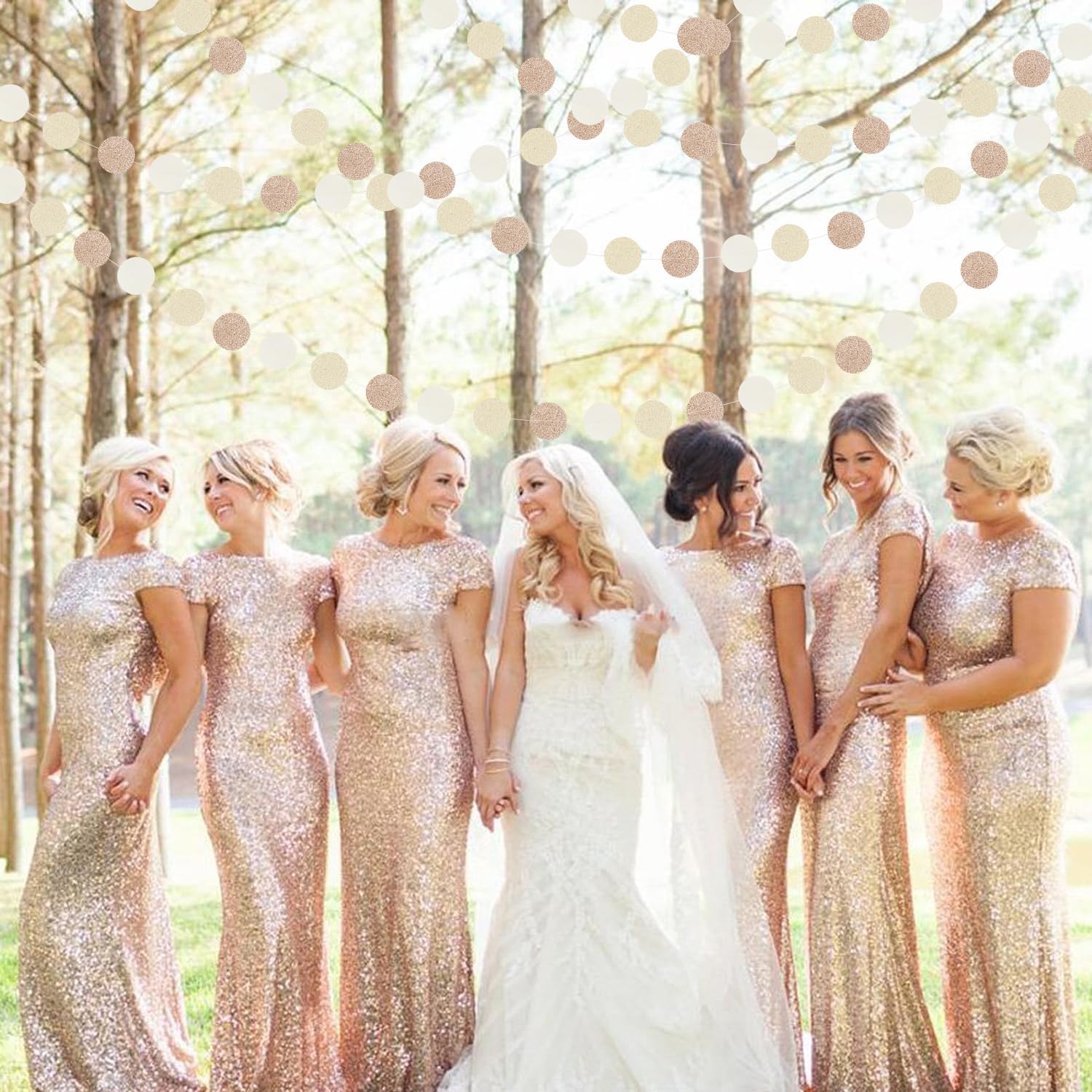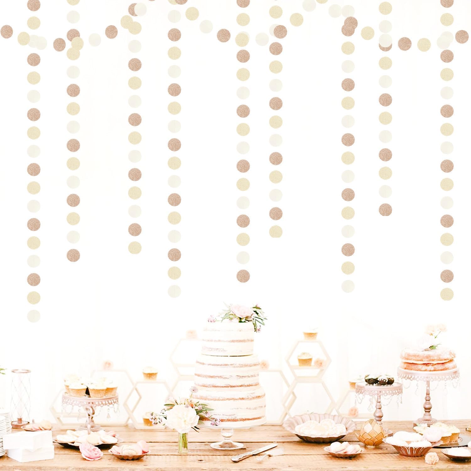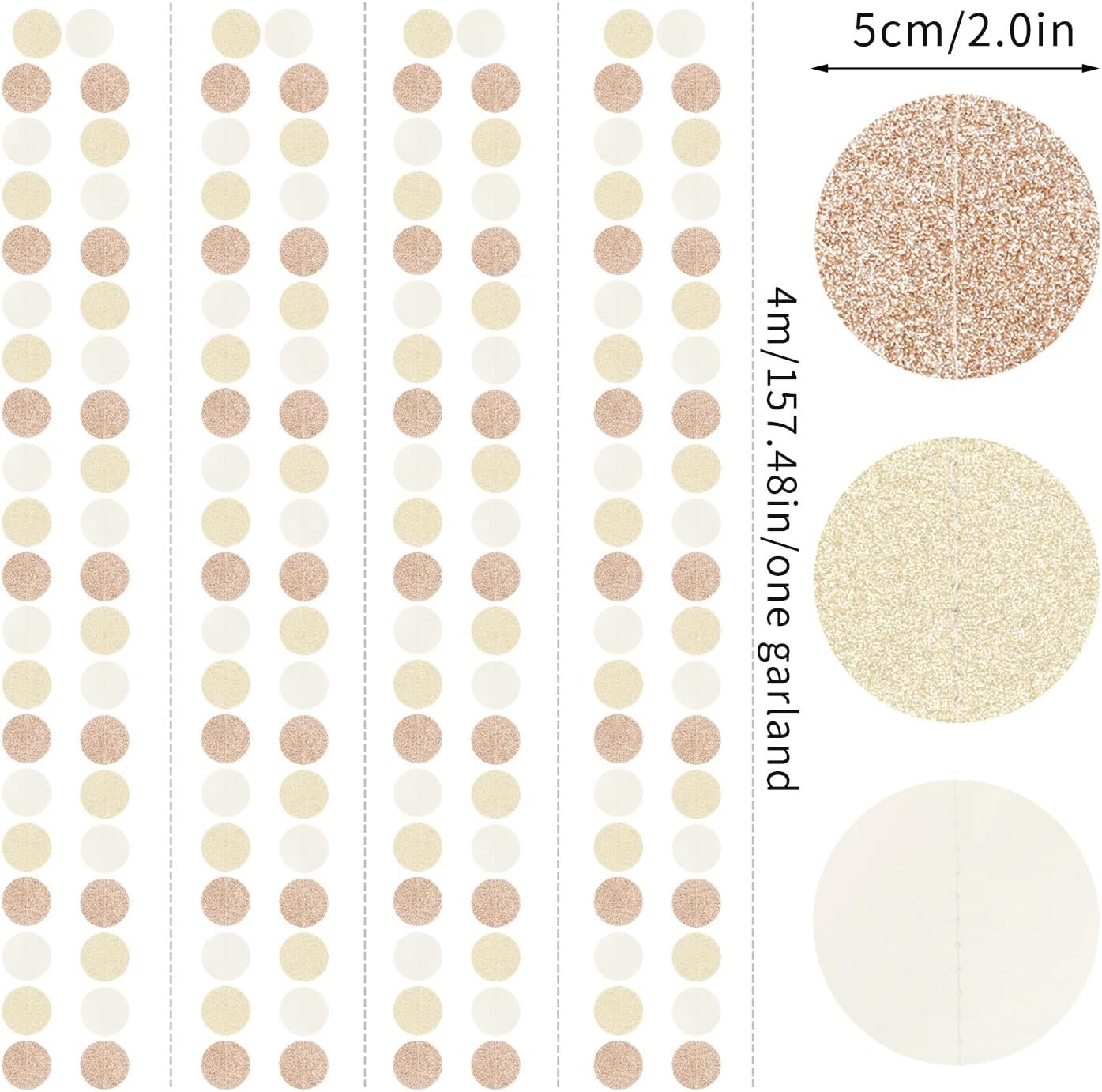 - 【Champagne Gold Party Decorations Kit Includes】The party garlands includes 4pcs paper garlands, each backdrop bunting is 13 feet/ 4 meters long, total length is 52 feet/16 meters. Every Banner has 40pcs dots which the size is 2".
