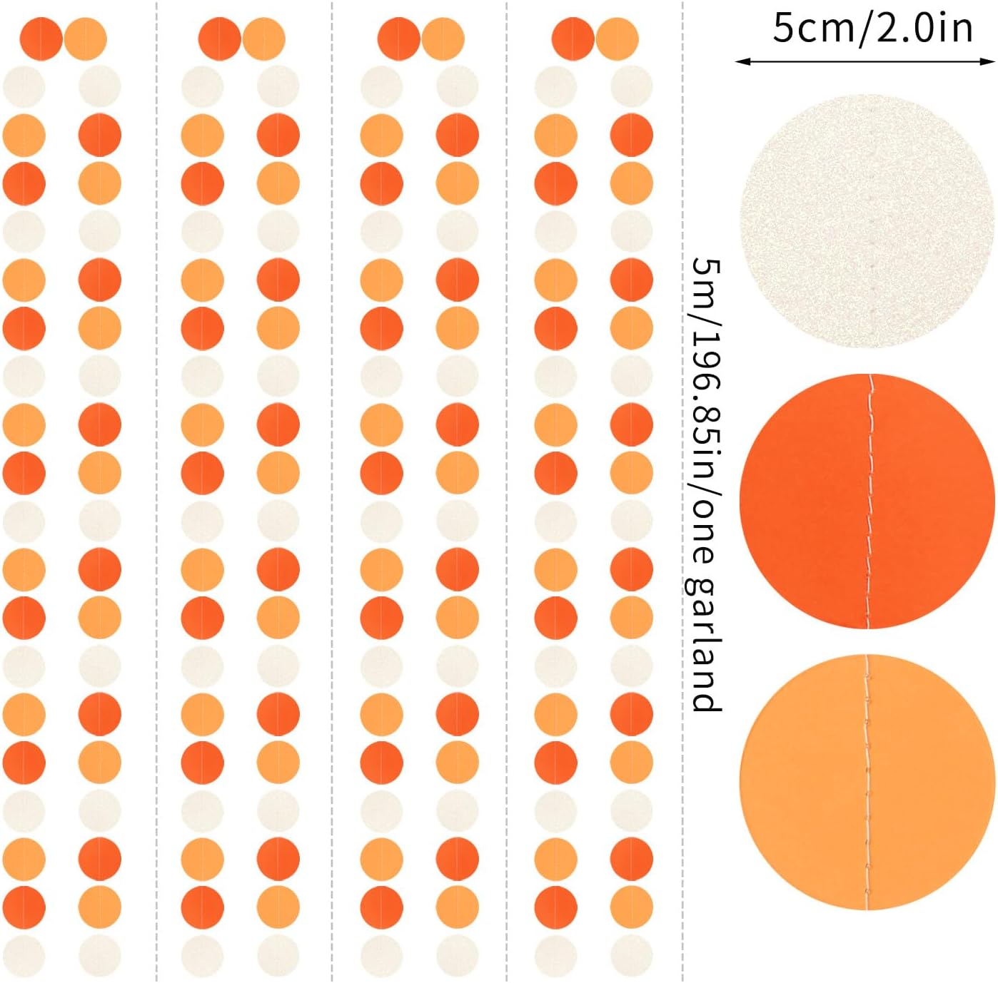 - 【Orange White Party Decorations Kit Includes】The party garlands includes 4pcs paper garlands, each backdrop bunting is 13 feet/ 4 meters long, total length is 52 feet/16 meters. Every Banner has 40pcs dots which the size is 2".