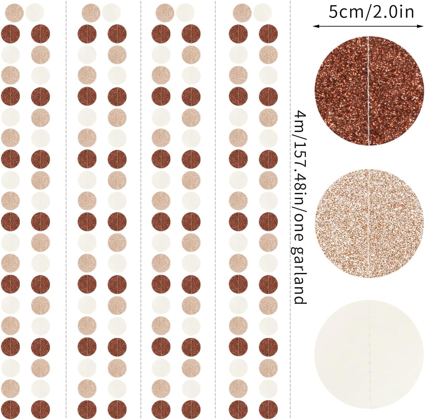 - 【Brown Champagne Gold Party Decorations Kit Includes】The party garlands includes 4pcs paper garlands, each backdrop bunting is 13 feet/ 4 meters long, total length is 52 feet/16 meters. Every Banner has 40pcs dots which the size is 2".