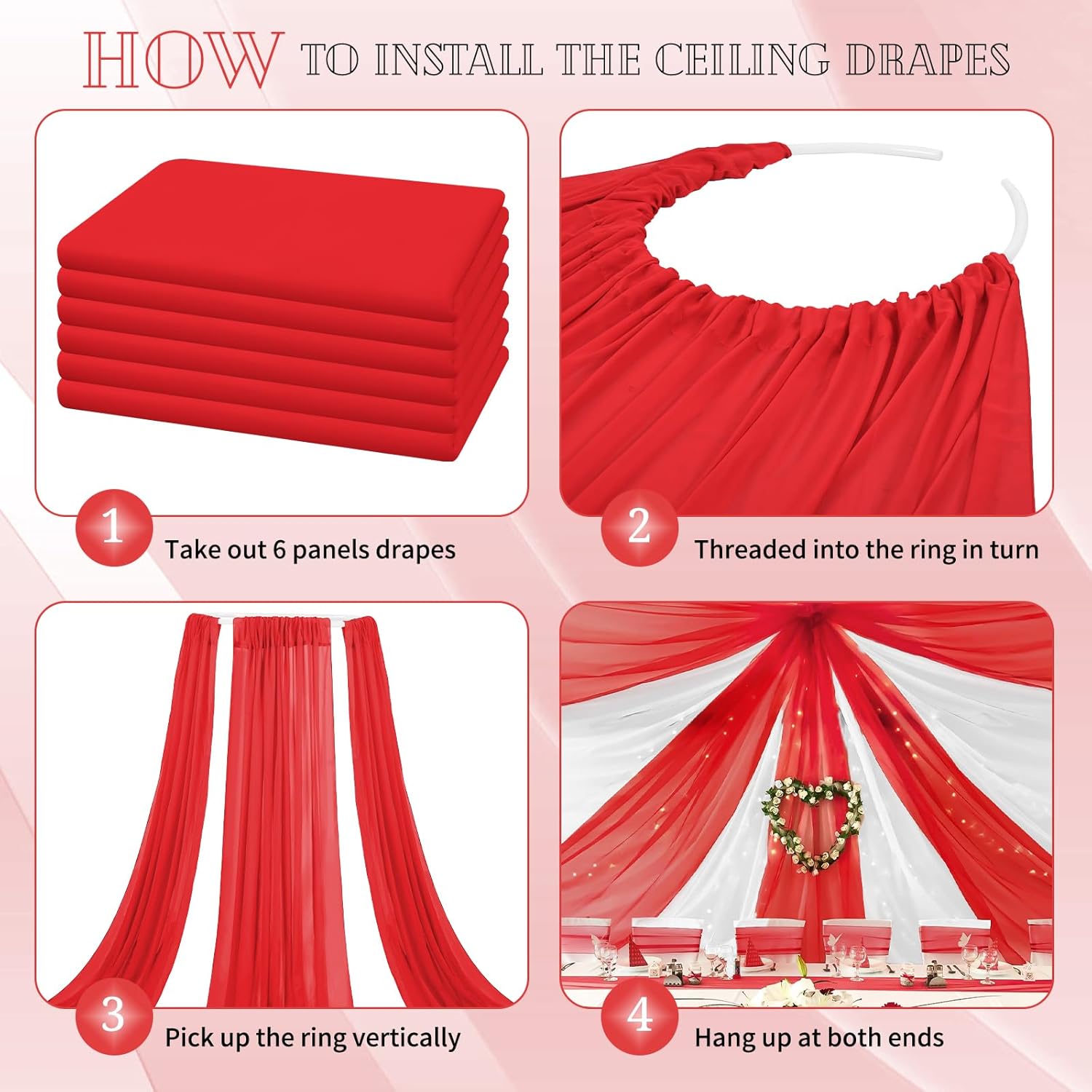 - 【Chiffon Fabric Curtain】The package will include 6 panels red wedding ceiling drapes (Not include stand), each wedding extra long curtain measures 5 feet(60inch)wide x10 feet(120inch) long. Sufficient quantity can meet your needs. These arch draping are applicable for any indoor and outdoor occasion either for decorative or functional uses.