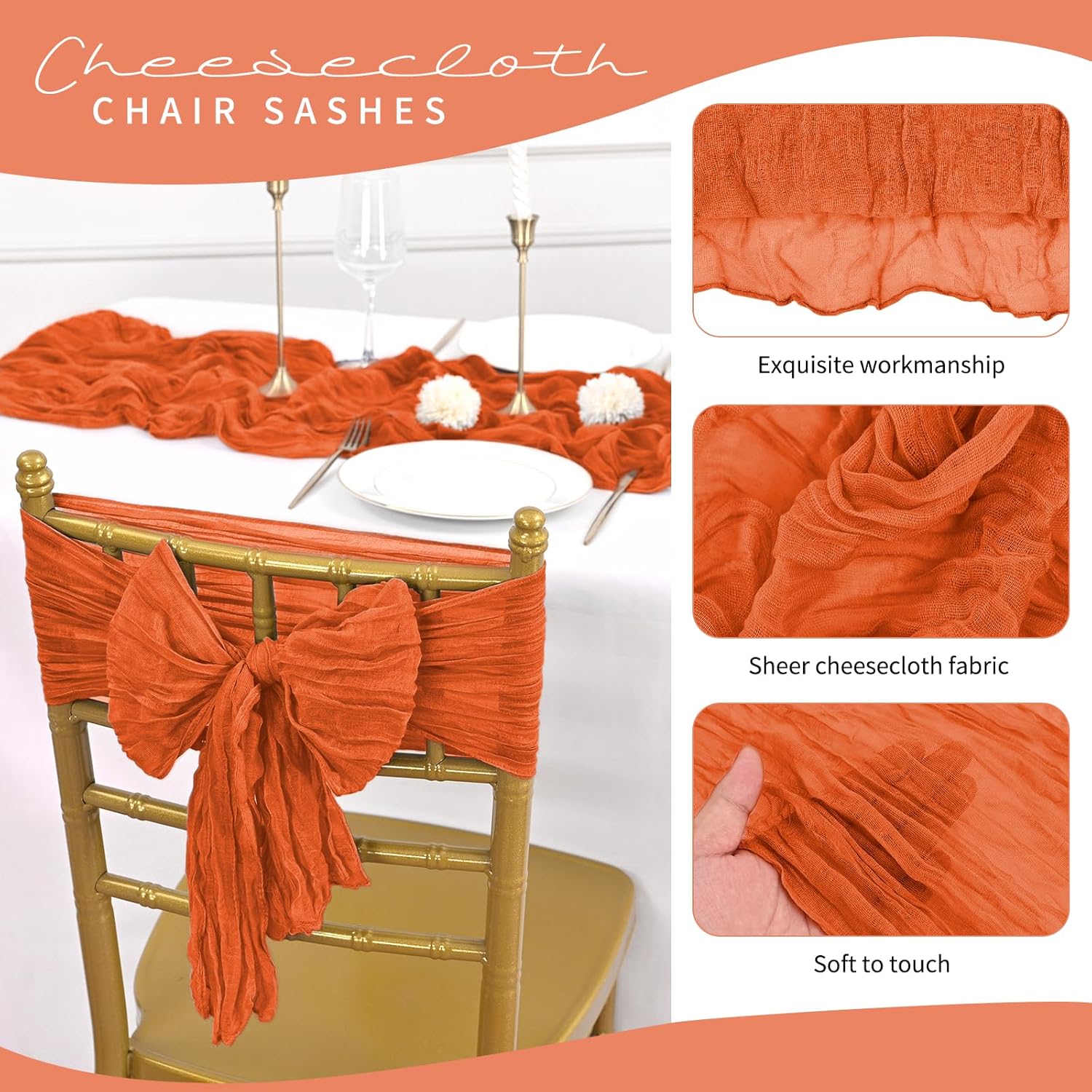 - 【Delicate Craftsmanship】Burnt Orange cheesecloth chair sashes adopt unique pleated workmanship, and the overall appearance is simple and elegant, creating an elegant and romantic atmosphere easily. The edges are carefully stitched to keep a perfect flowing condition, will not get broken or loose easily, can serve you for a long time