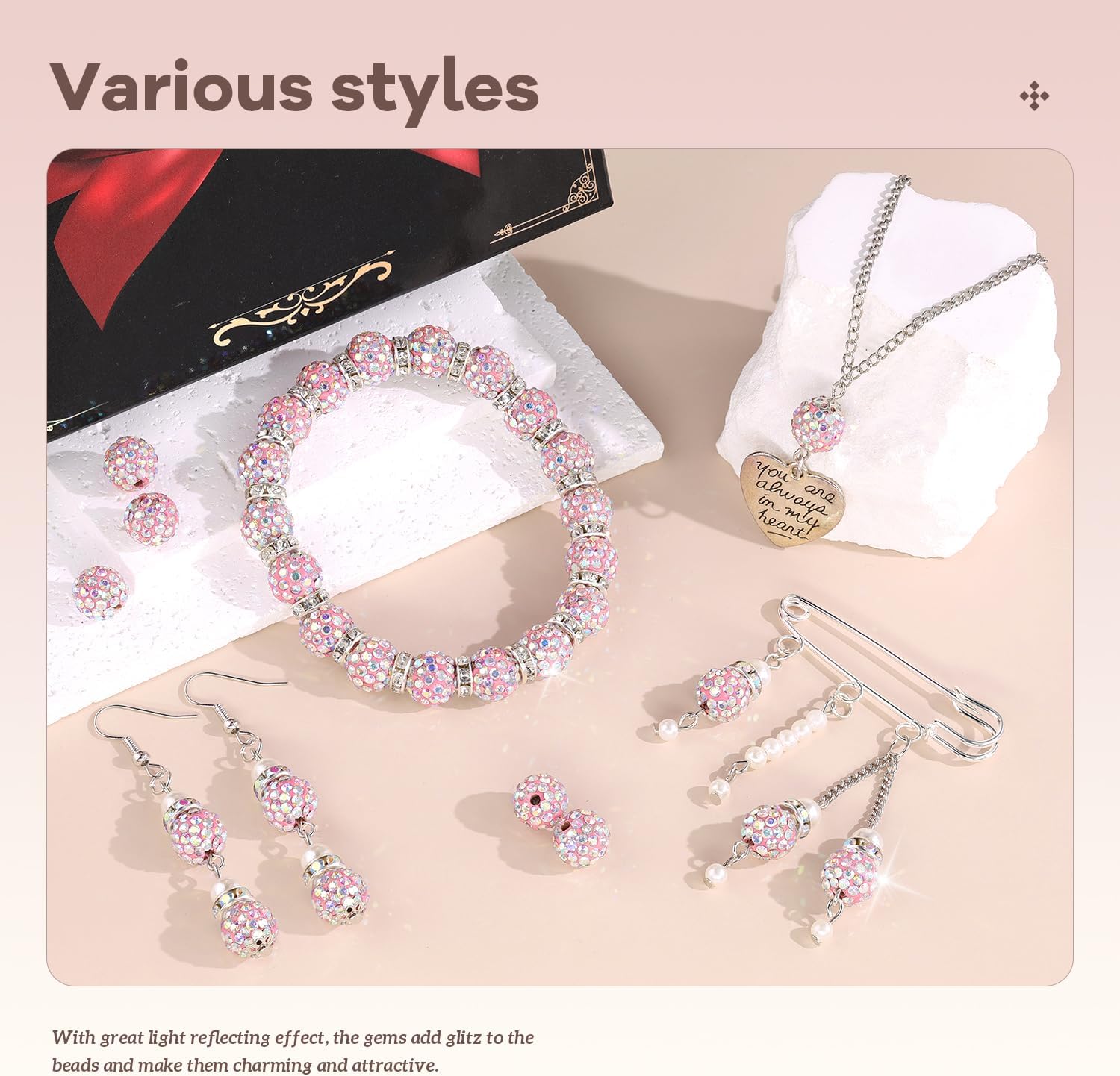 105pcs 10mm Rhinestone Beads for Jewelry Making, Pink AB Shiny Round Disco Ball Beads Bulk, Sparkle Crystal Clay Christmas for Bracelet Baseball Necklace Earring Crafting and DIY