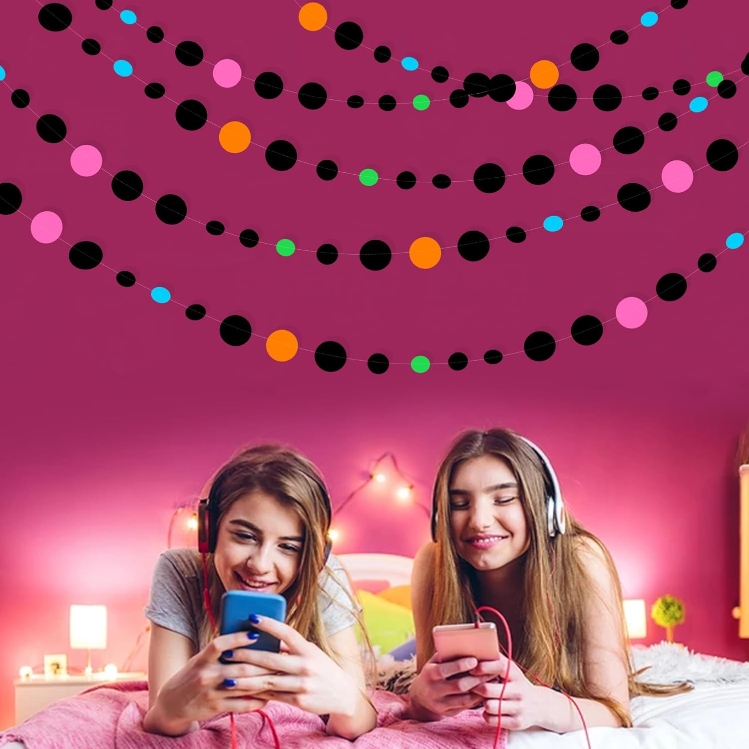- Package Contains: 4 set of colorful black circle dot party garlands banner,each string is 11.5 feet/3.5 meters, Total is 14 meters/46 feet.