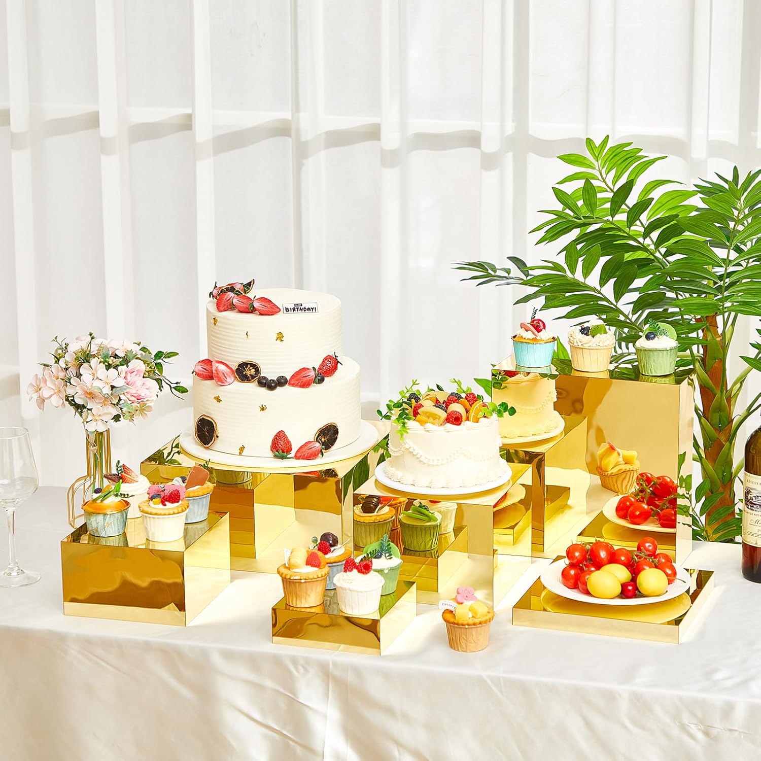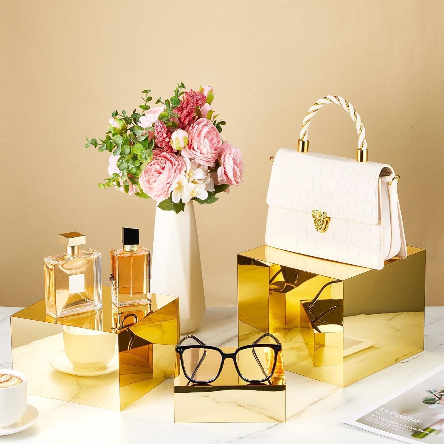 - Gold Aesthetics: our acrylic display stands showcase a simple yet elegant design; The gold color offers an unobstructed view of your displayed items, enhancing their beauty and visibility; Whether it's jewelry, cakes or other products, these cubes ensure they are the center of attention