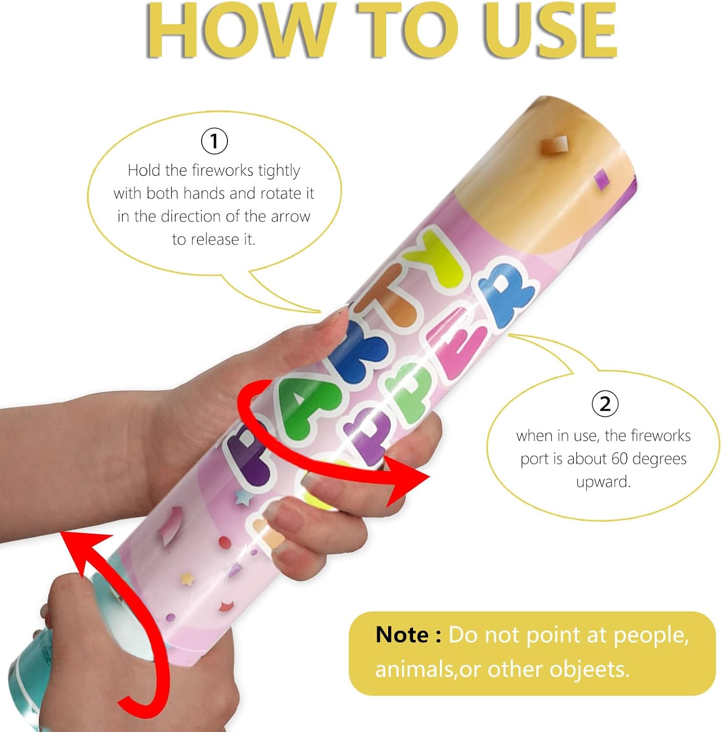 - 【Simple to Use】You just twist the bottom of the cannon with your hand and aim straight up, each party popper shoots confetti up to 15-20 feet in the air.