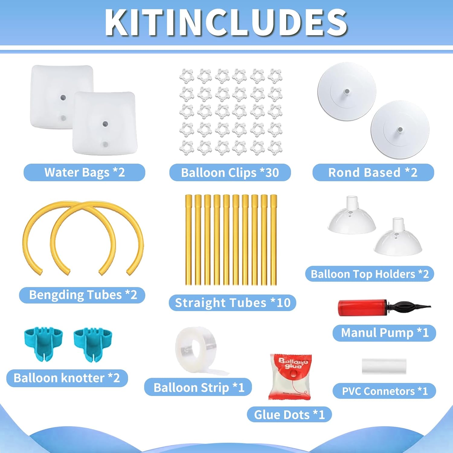 - ăAll-in-One KităOur balloon arch kit includes everything you need: 10 straight poles, 2 bendable top poles, 2 round bases, 2 water/sand bags, 30 balloon clips, 2 balloon top supports, 2 balloon knotters, 1 roll of glue dots, 1 balloon arch strip, 1 PVC connector, 1 manual pump, and detailed instructions.
