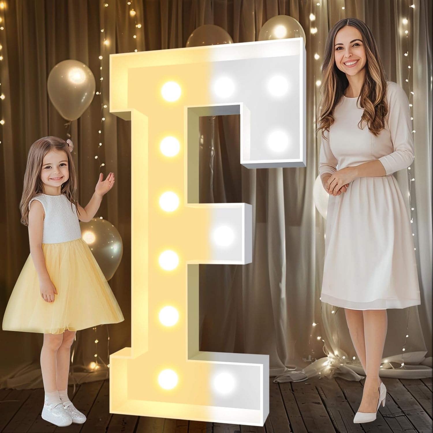 - Giant 4 Feet Marquee Letters with LED Lights: Mosaic letters designed with warm white LED string lights. Giant LED letters can be powered by 3 AA batteries (Not Included) or USB, convenient for all kinds of party decoration