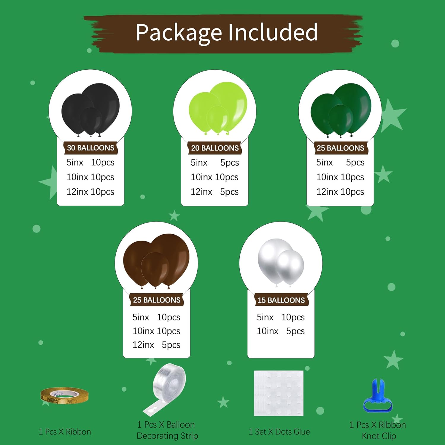 - 【Package Included】115Pcs green-brown black balloon garland kit includes 12-inch, 10-inch, and 5-inch latex balloons (detail see image), and 4pcs balloon arch DIY accessories. Our latex balloons are made from quality materials, ensuring they maintain their shape and color for longer periods. This means that your balloon arch will stay looking fresh and vibrant throughout your event, leaving a lasting impression on your guest