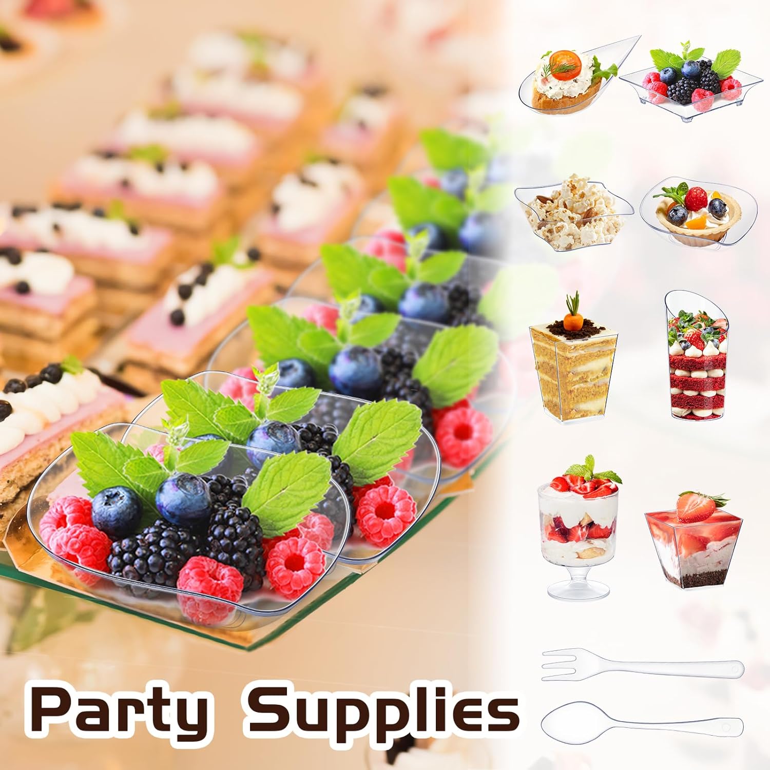 - Assorted Styles and Sizes: the mini appetizer plates and cups with spoons have 8 different cute styles (leaf, tear drop, square, goblet, cylinder, slanted, etc), and the specific size information can be seen on the pictures, being a cute and attractive addition to your party