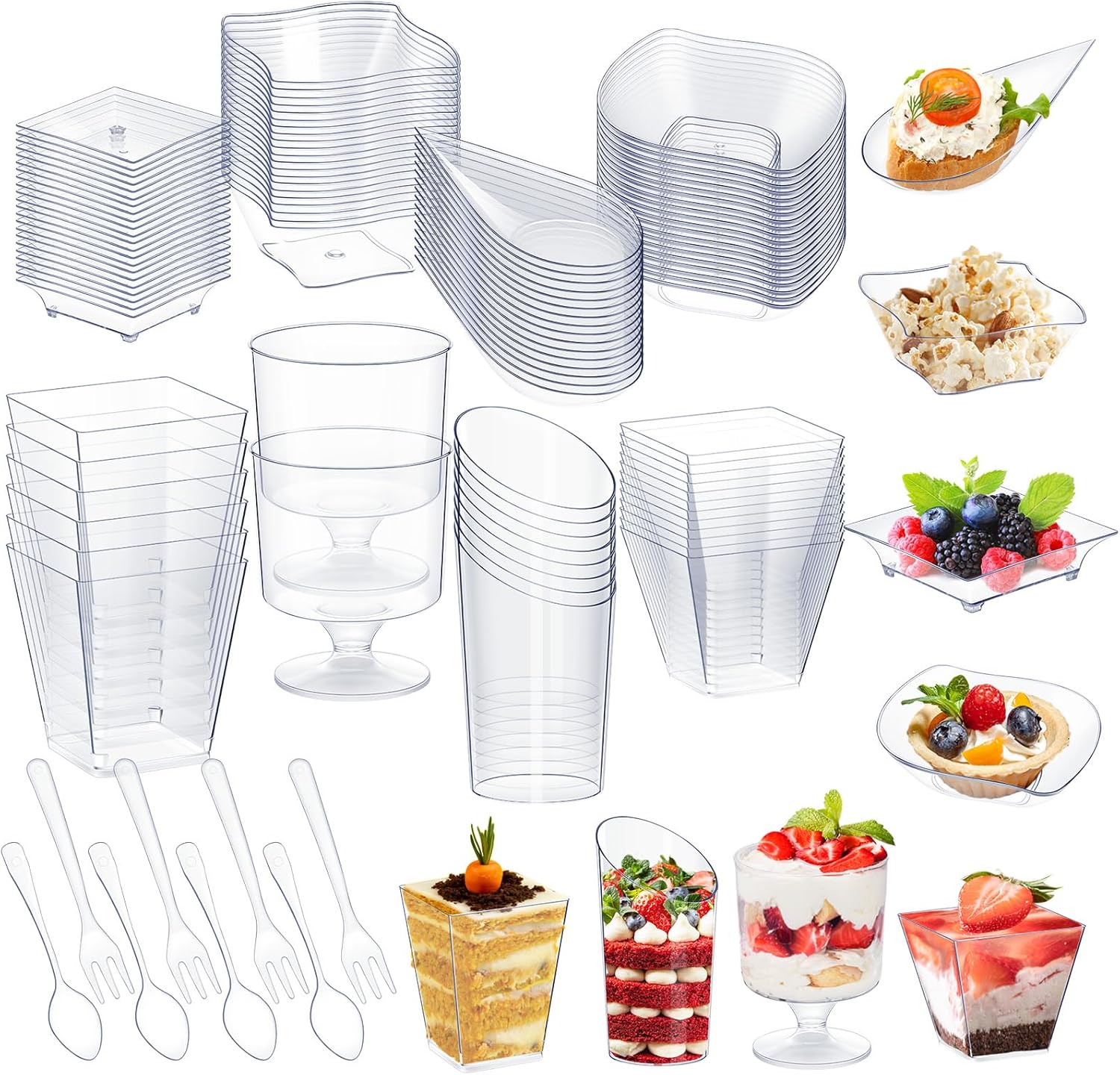 Tessco for you 160 Pcs Mini Appetizer Plates Dessert Cups Spoons Forks Set Dessert Containers Assorted Shape Plastic Parfait Cups Disposable Spoon Forks for Party Serving (Clear)