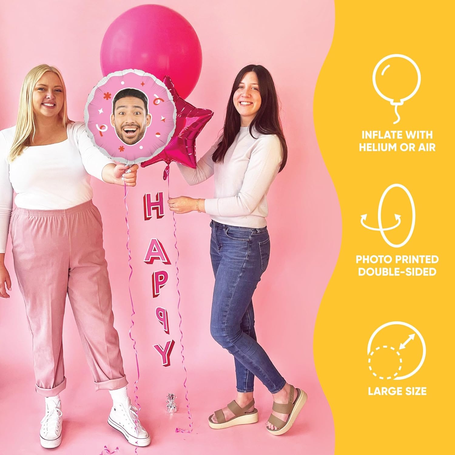 - Personalized Fun: Printed double-sided on a circle mylar balloon with pink design accents, Fun Face Balloon is the perfect way to shine the spotlight (or embarrass) the guest of honor! Add this custom balloon to any birthday party, baby shower, bachelorette party, graduation party, retirement party, or corporate logo event. Simply click "customize now" to get started.