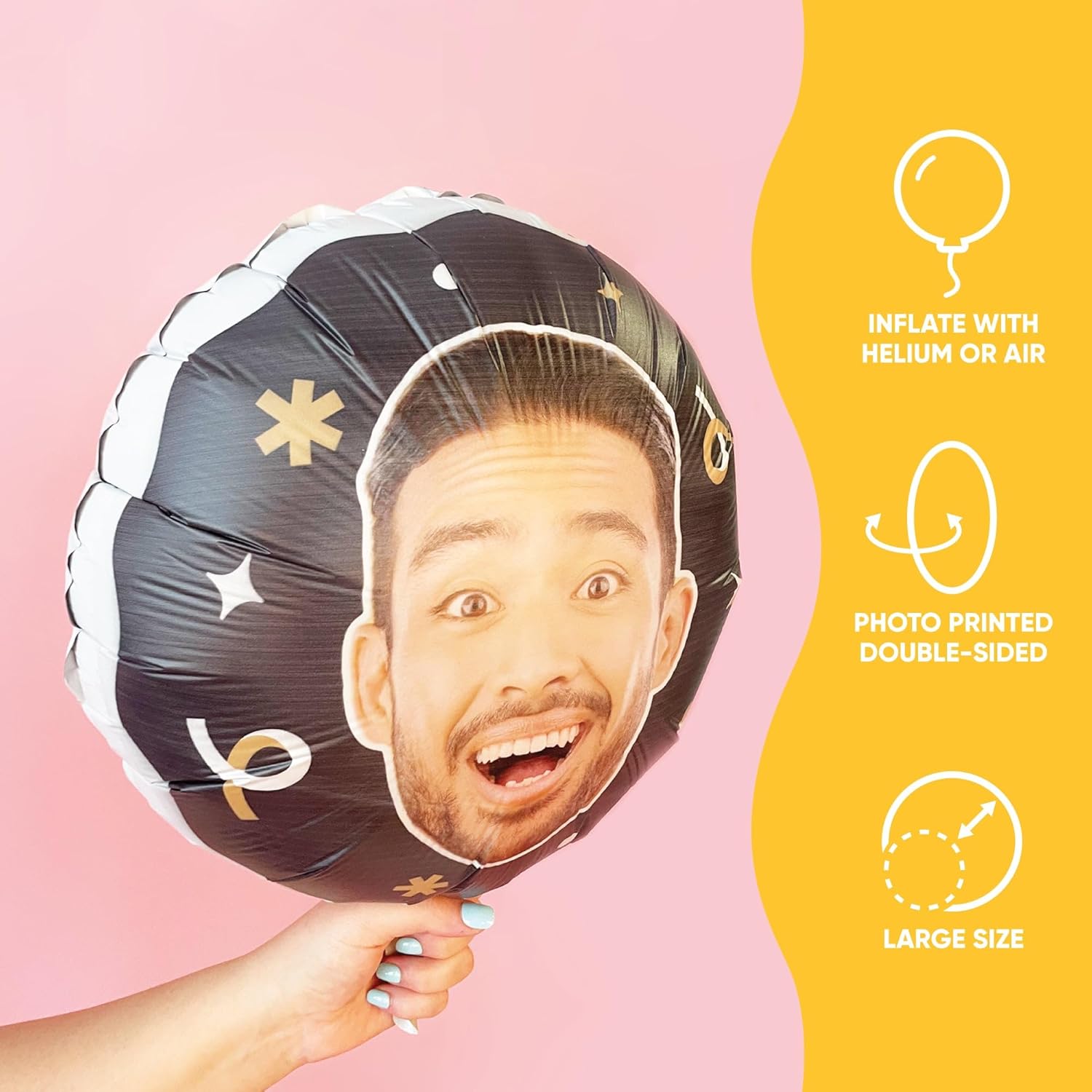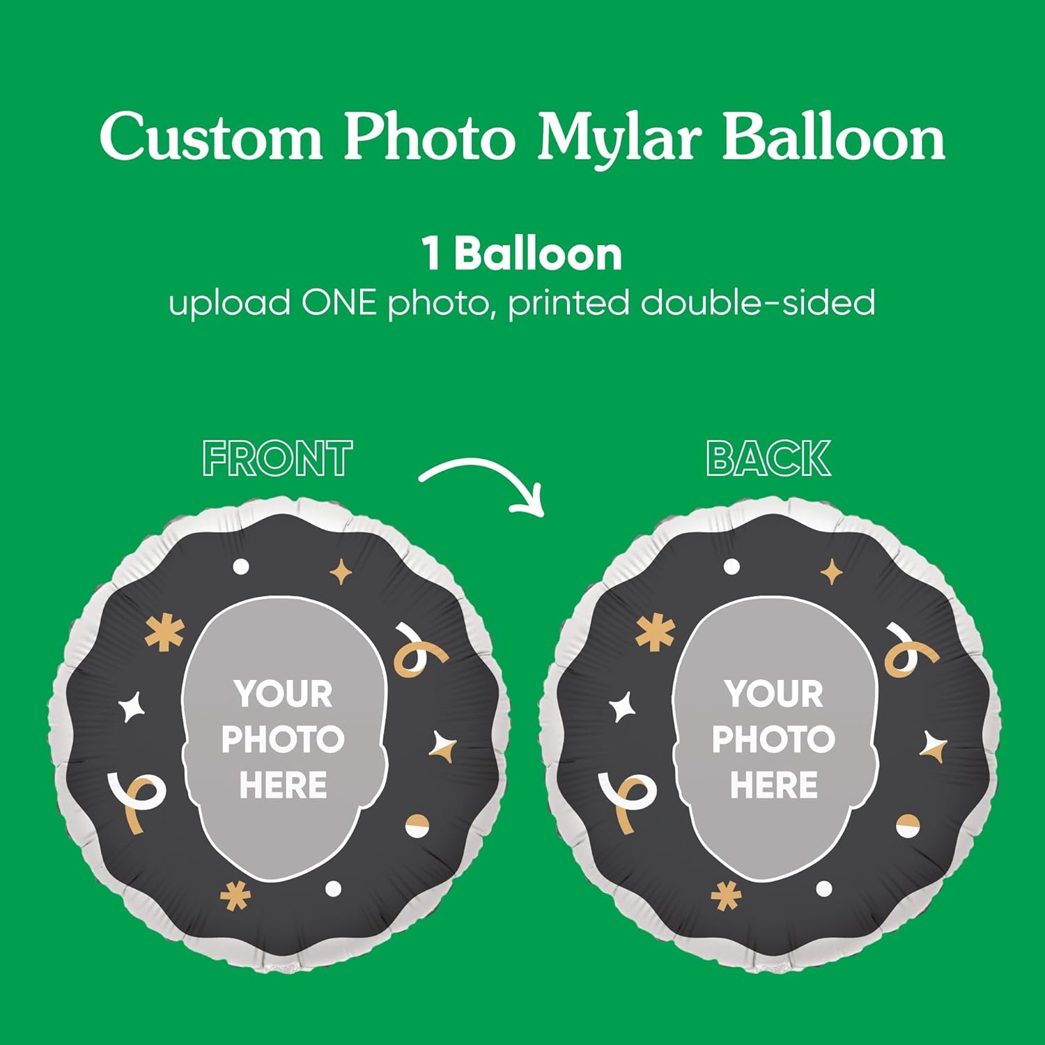 - Personalized Fun: Printed double-sided on a circle mylar balloon with black & Gold design accents, Fun Face Balloon is the perfect way to shine the spotlight (or embarrass) the guest of honor! Add this custom balloon to any birthday party, baby shower, bachelorette party, graduation party, retirement party, or corporate logo event. Simply click "customize now" to get started.
