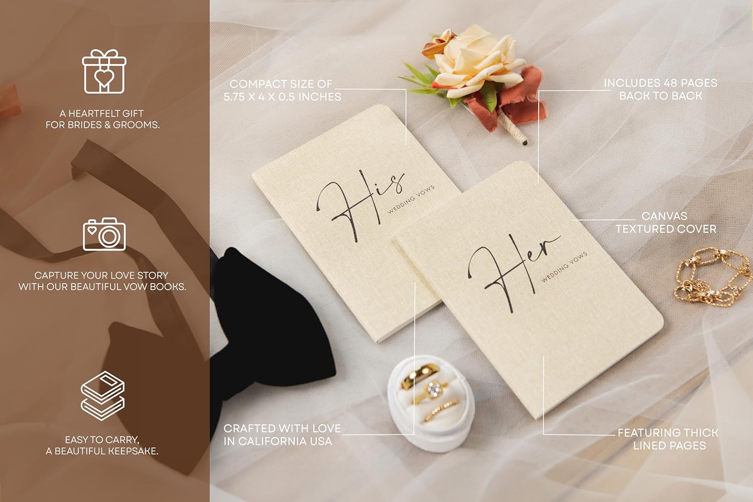 - Another key feature is the sentimental value these vow books bring to your wedding day. Their compact size fits seamlessly into your ceremony, adding intimacy and significance. These vow books serve as practical tools and cherished keepsakes, preserving your vows beautifully for the next page of your lives.