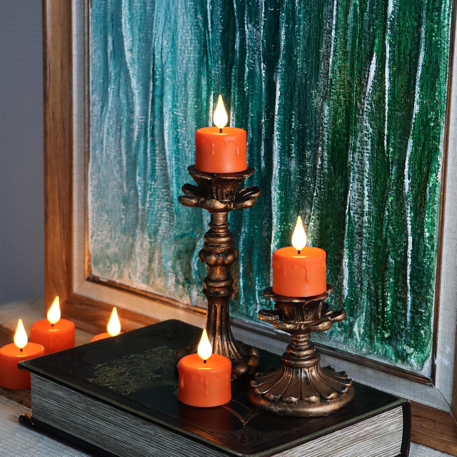 - [Widely Use]These led lights candles have an orange realistic little candle appearance, which fits the Halloween theme very well, adding a lovely touch to Halloween and autumn festivals. The orange tea candles can be used as decorations alone, whether placed on a table or lit at night, their flickering lights are perfect for creating an atmosphere; at the same time, they can also be used with other Halloween decorations.