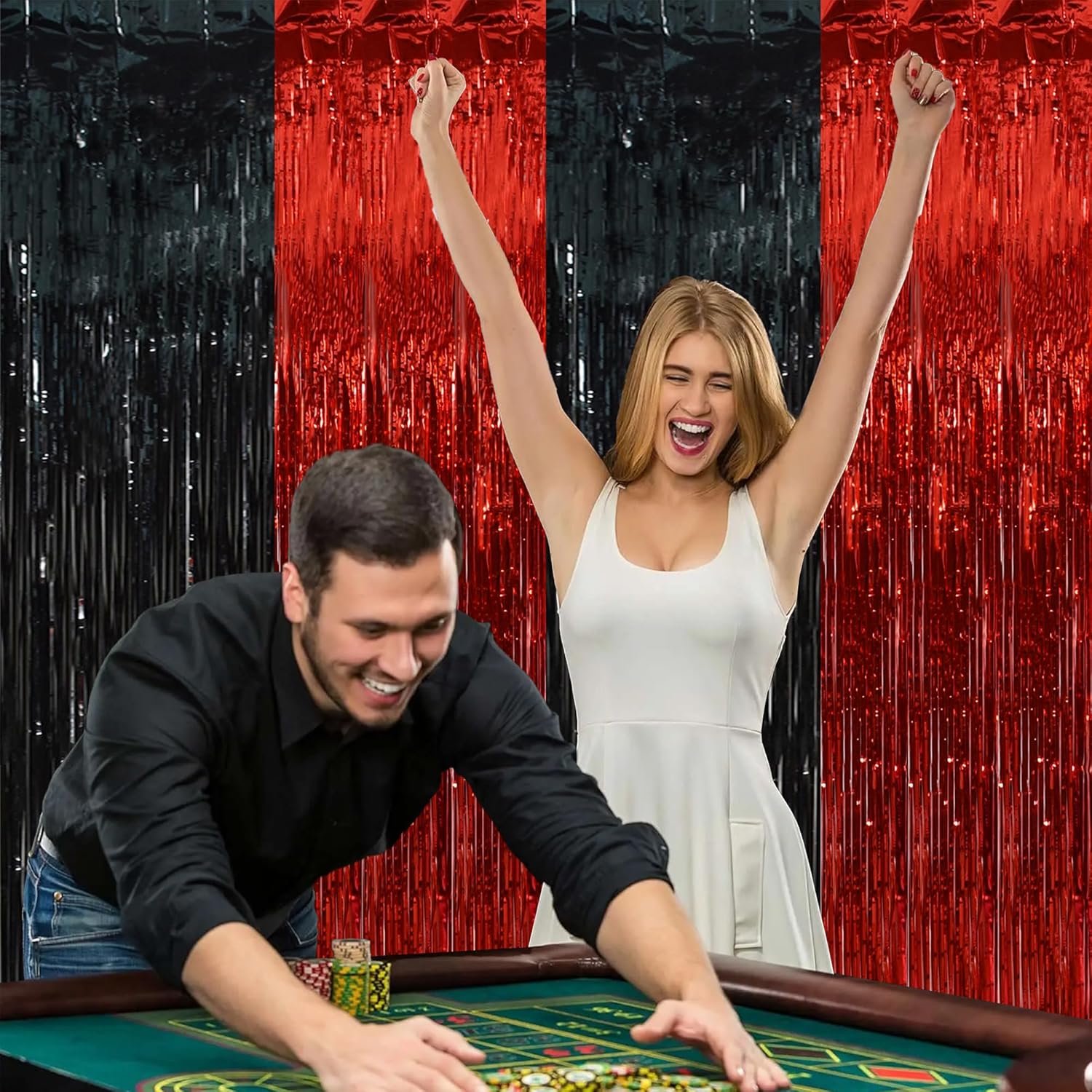 BEISHIDA 2Pcs Red Black Door Streamer Casino Backdrop Foil Fringe Tinsel Casino Horry Party Curtains Backdrops for Casino Party Horry Party Hallowen Decoration (3.28 ft x 6.56 ft)