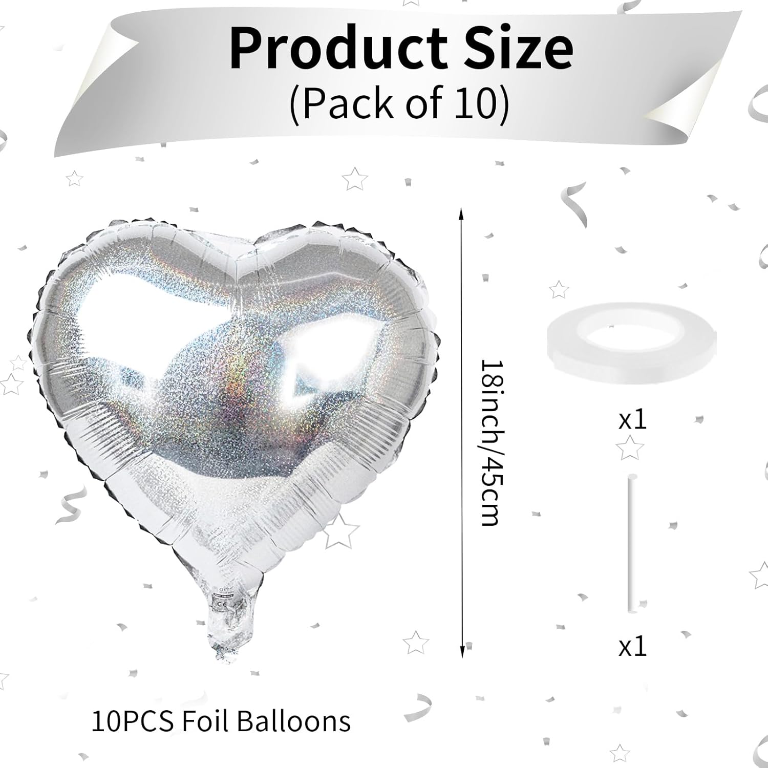 - 10 PCS Silver Heart Balloons: Our package contains 10 x 18 inches glitter silver heart shaped balloons, 1 x 10m ribbon. The silver foil heart balloons are specially designed to add a touch of fun and surprise to any party or holiday celebration. With a size of 18 inches, they are the perfect addition to your decorating needs, leaving your guests with an unforgettable smile!