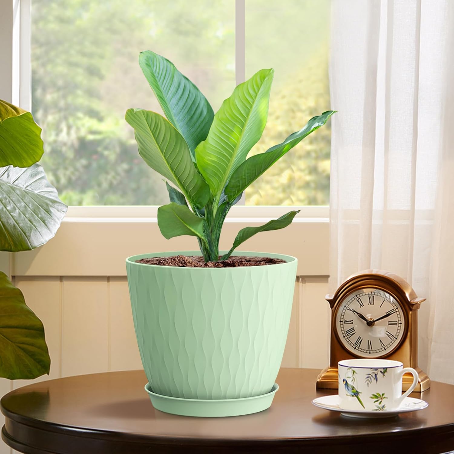 6 inch Plant Pots, 5 Pack Flower Pots with Drainage Holes and Saucers for Indoor Plants, Plastic Planters with Water Ripple for Small Garden House Plants, Nursery Pots for Succulent, Green