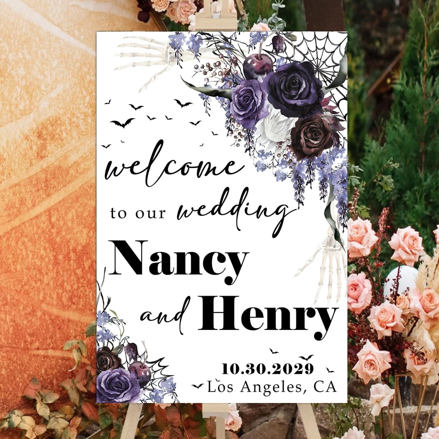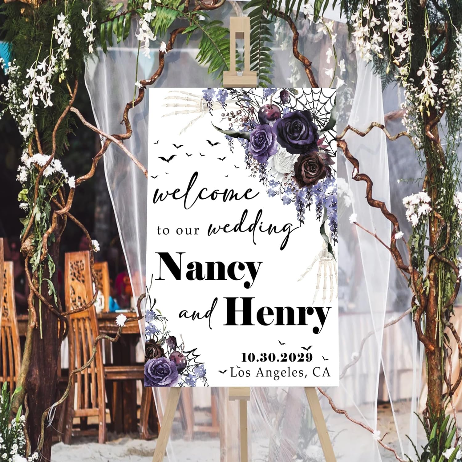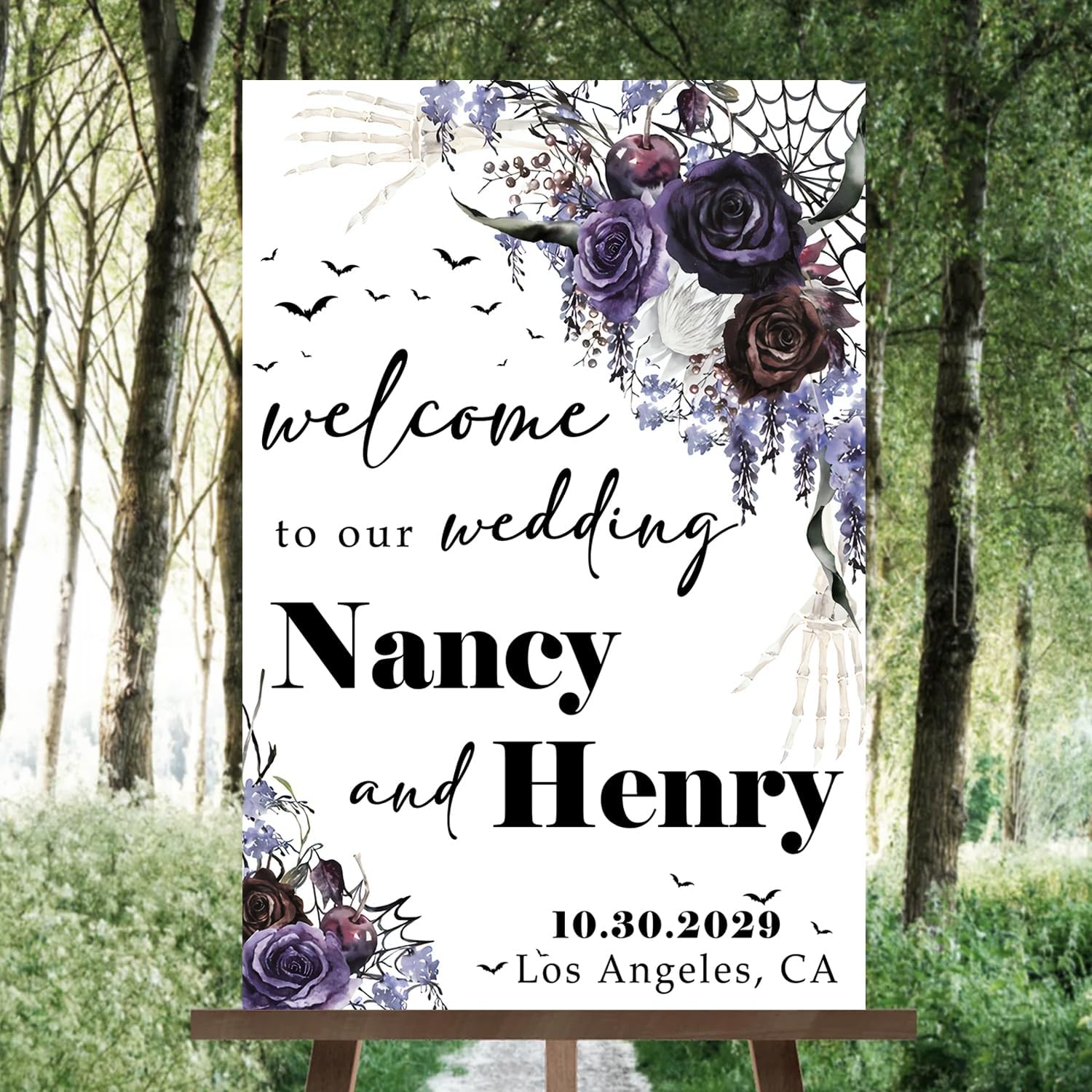 - A stunning choice for those planning a Gothic-inspired wedding or a Halloween-themed celebration. Whether you're exchanging vows on All Hallows' Eve or simply love the allure of Gothic aesthetics, this welcome sign will captivate your guests and make a bold statement.