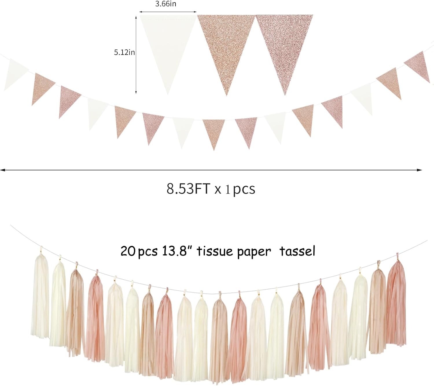 - 【Champagne Gold Beige Peach Party Kits】The bohemian party decorations kits include 6pcs tissue paper flowers: 3pcs 8" and 3pcs 10" in champagne gold beige color, 1pcs Triangle Flags,1pcs circle dots paper garland,20pcs tassel garland. Total23pcs.
