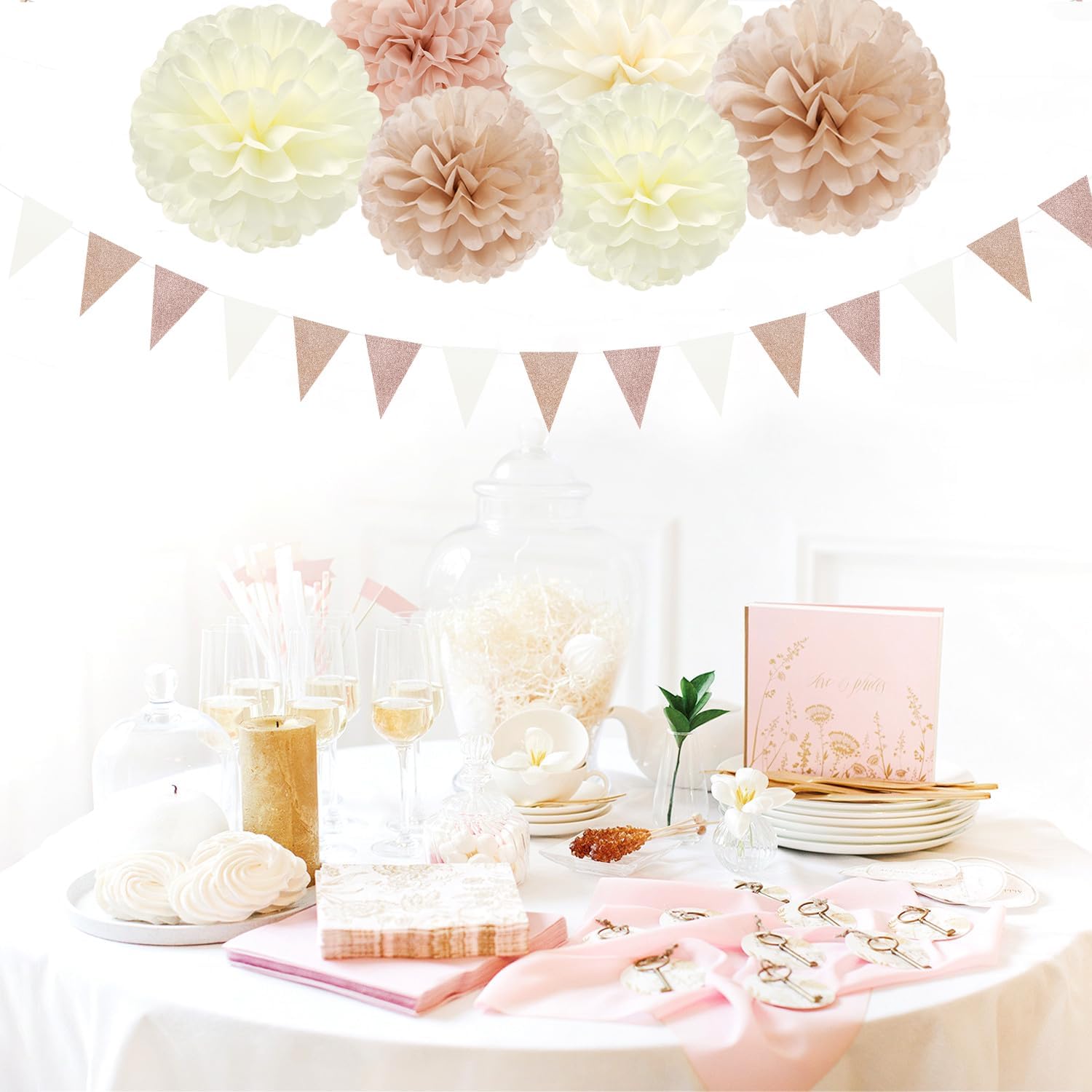 Champagne-Gold Beige Boho Baby-Shower Party-Decorations - 23pcs Fall Rustic Neutral Bridal Wedding Paper Tissue Pom Poms Streamers,Retro Tassel Garland,Girl Birthday Banner Decor Lasting Surprise
