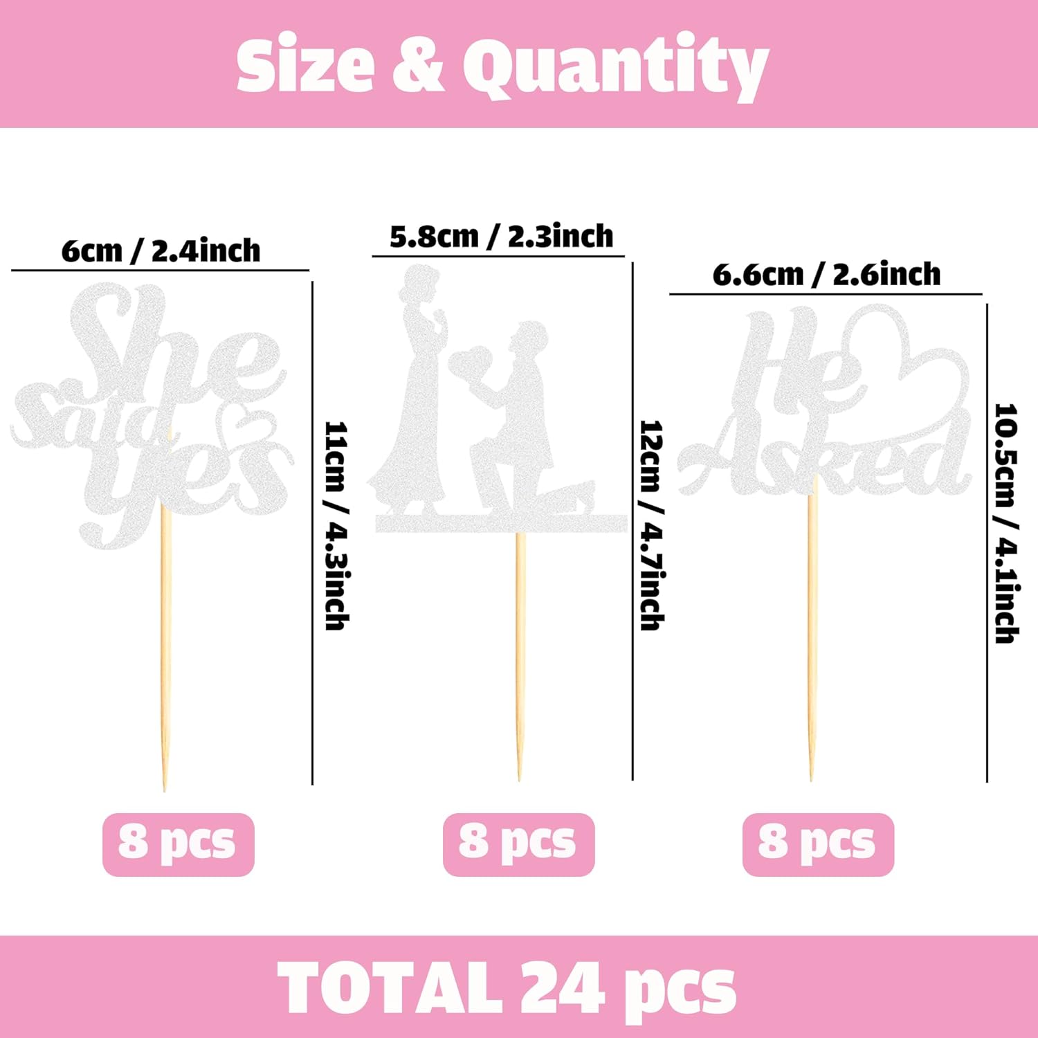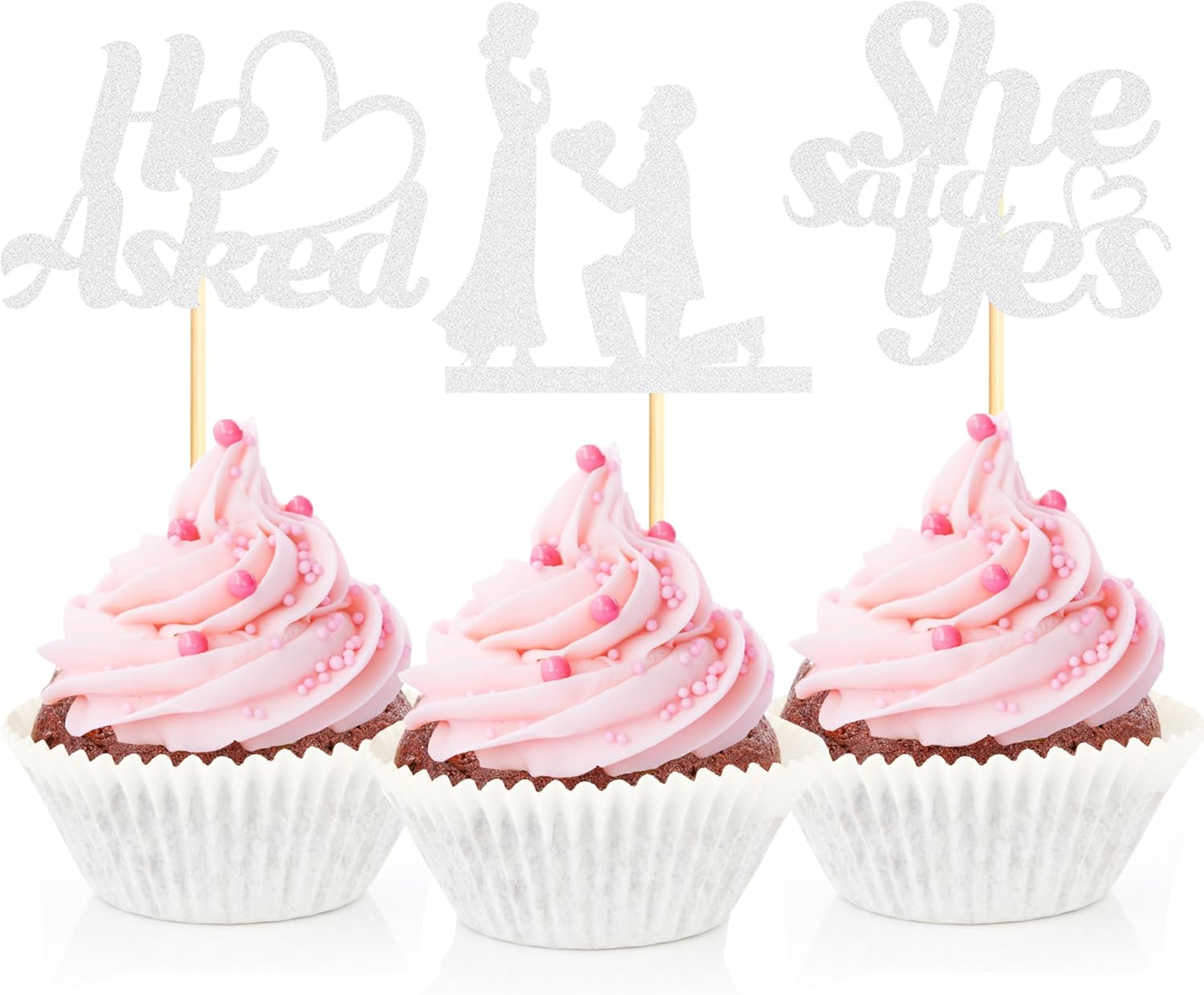 - Unique Design: This silver 24PCS He Asked She Said Yes Cupcake Toppers to make your Wedding Engagement party stand out! The delicate design like your a match made in heaven makes your dessert look more romantic. Shimmering glitterscreate a lovely and sweet feel for your wedding party