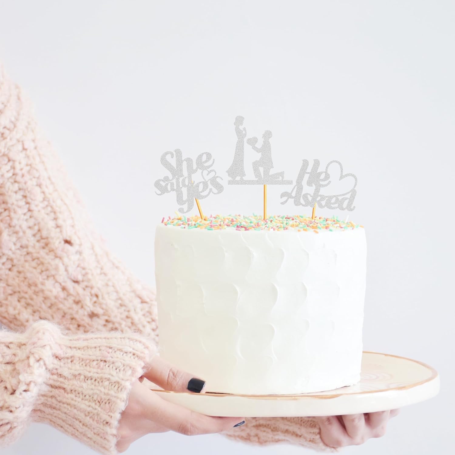 - Package Included: 3PCS Silver Glitter He Asked She Said Yes Cupcake Toppers add "propose"sign. Already assembled so you can insert into wedding engagement party decoration, which make your cake icing on the cake. Size: W 2.3 inch * H 4.72 inch / W 6 cm * H 12 cm(Including Stick)