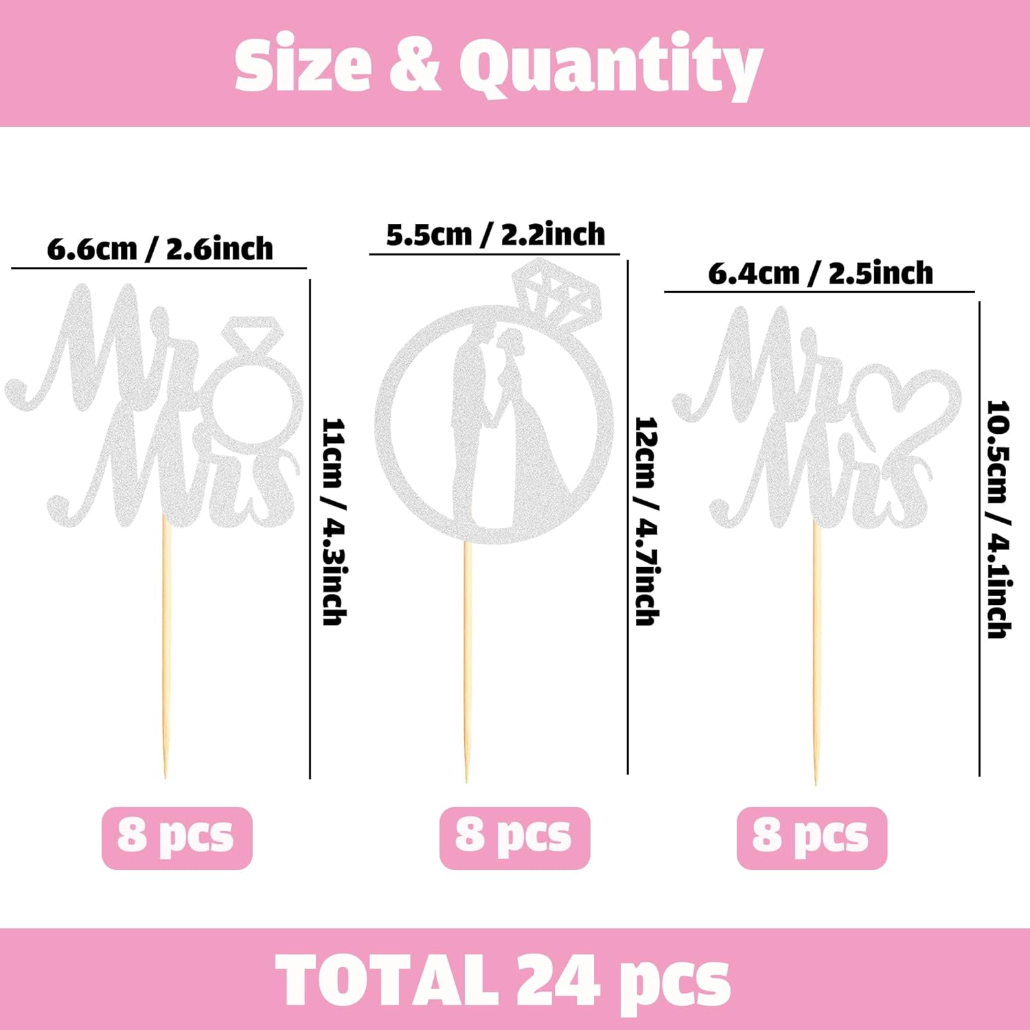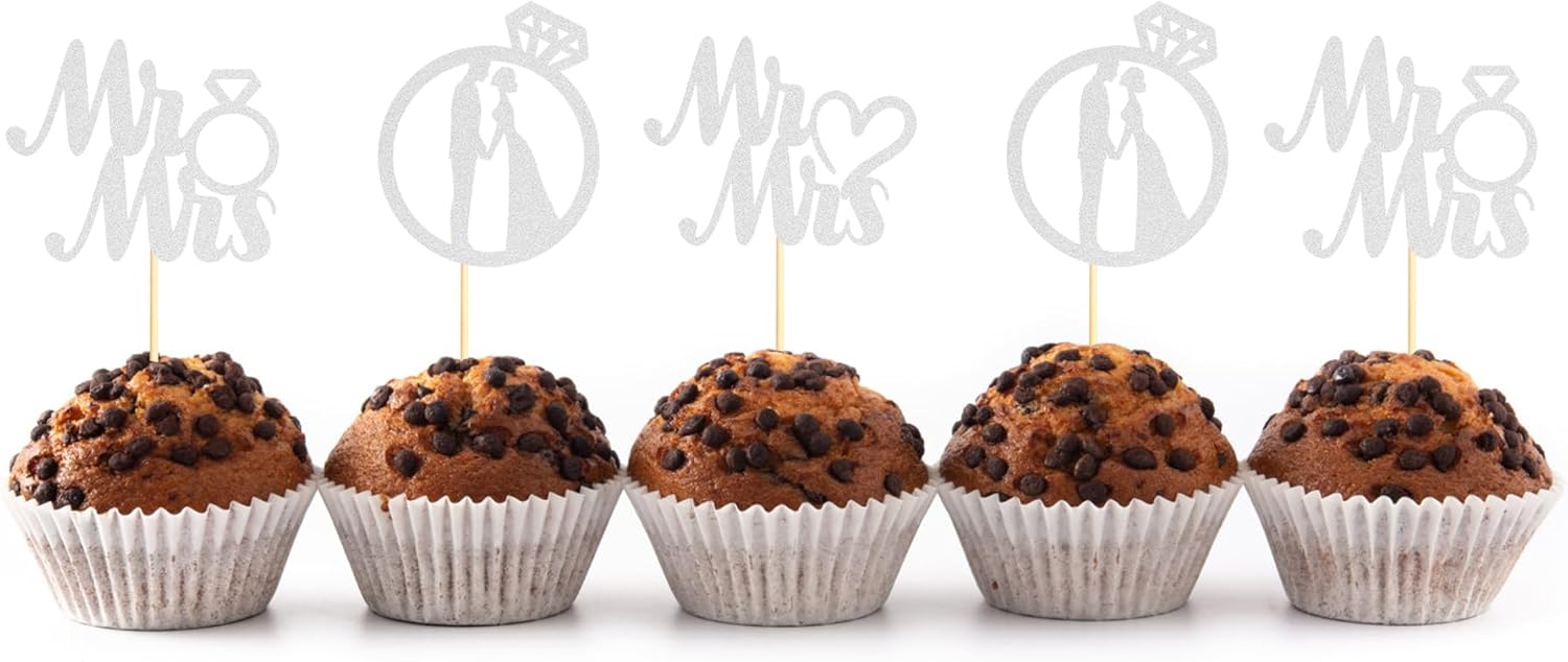 - Unique Design: This 24PCS Miss to Mrs Cupcake Toppers to make your Wedding Engagement party stand out! The delicate design like your a match made in heaven makes your dessert look more romantic. Shimmering glitterscreate a lovely and sweet feel for your wedding party