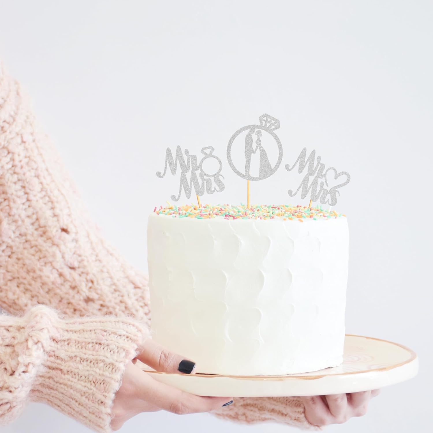 - Package Included: 3PCS Silver Glitter Miss to Mrs Cupcake Toppers add "ring"sign. Already assembled so you can insert into wedding engagement party decoration, which make your cake icing on the cake. Size: W 2.3 inch * H 4.72 inch / W 6 cm * H 12 cm(Including Stick)