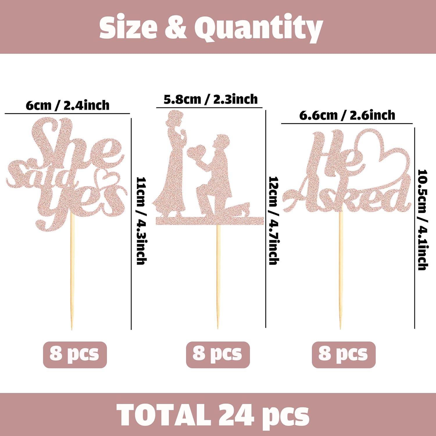 - Unique Design: This rose gold 24PCS He Asked She Said Yes Cupcake Toppers to make your Wedding Engagement party stand out! The delicate design like your a match made in heaven makes your dessert look more romantic. Shimmering glitterscreate a lovely and sweet feel for your wedding party