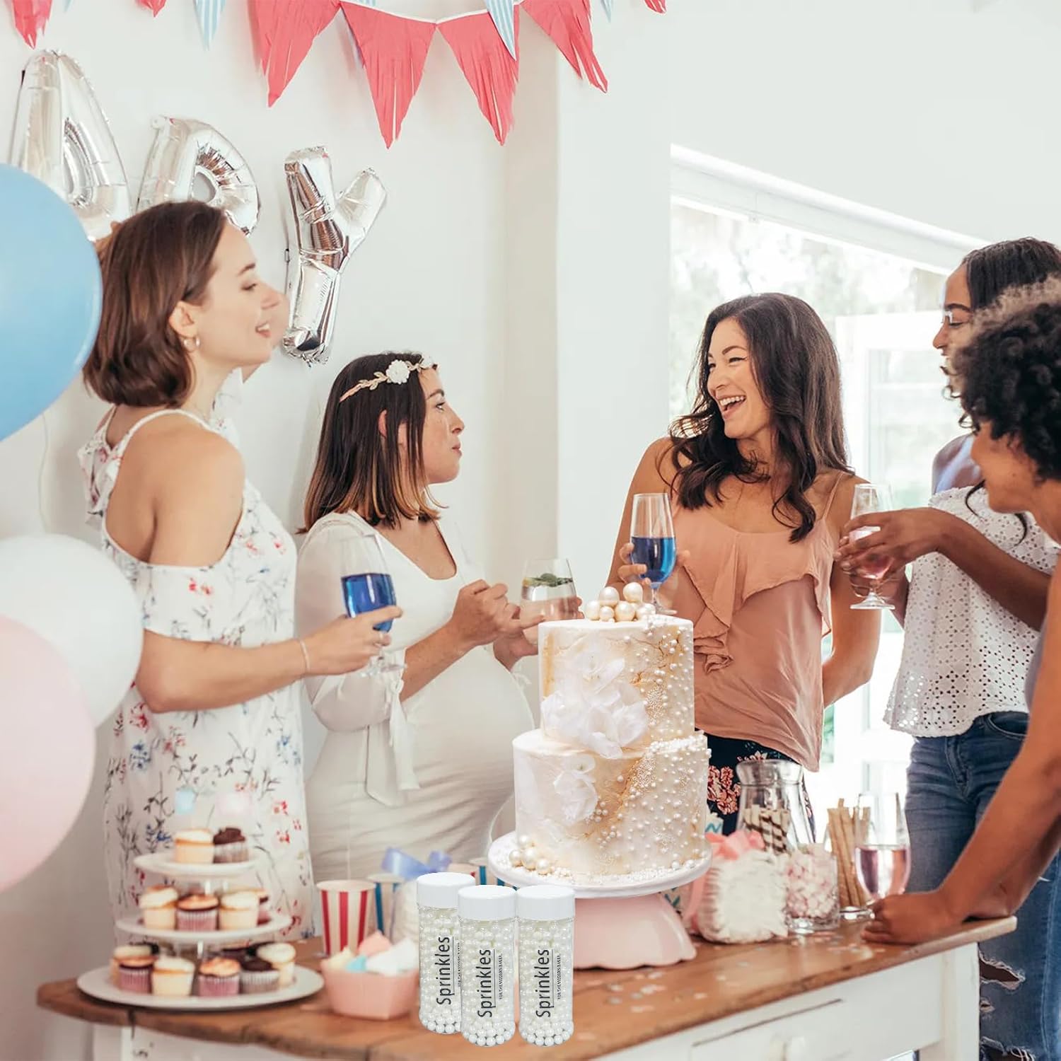 - 【Easy to use】: These white ball sprinkles can be used in many ways, for example, you can directly sprinkle them on food in large quantities, which is amazing and easy to use. You also can choose some parts of the sprinkles to decorate, as the icing for the dessert. These edible candy pearl sprinkles are nice decoration such as winter Christmas white themed birthday party, baby shower, wedding,bridal showers, anniversary, engagement etc.