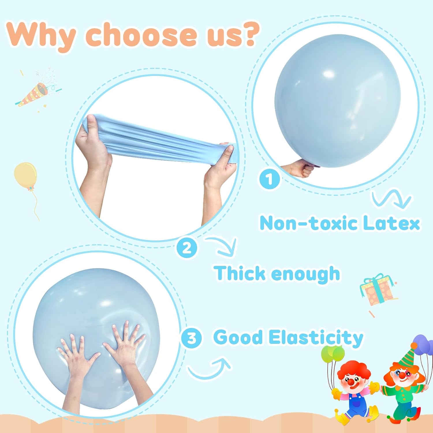 - ăSize& Quantityă Each sets contains 4pcs 36 inch giant pastel blue balloons; big balloons are safe ,heavy thick, bouncy and Eco-friendly latex material which is durable and long-lasting quality ,these big round balloons Thicker and much strong than typical balloons for longer lasting fun.