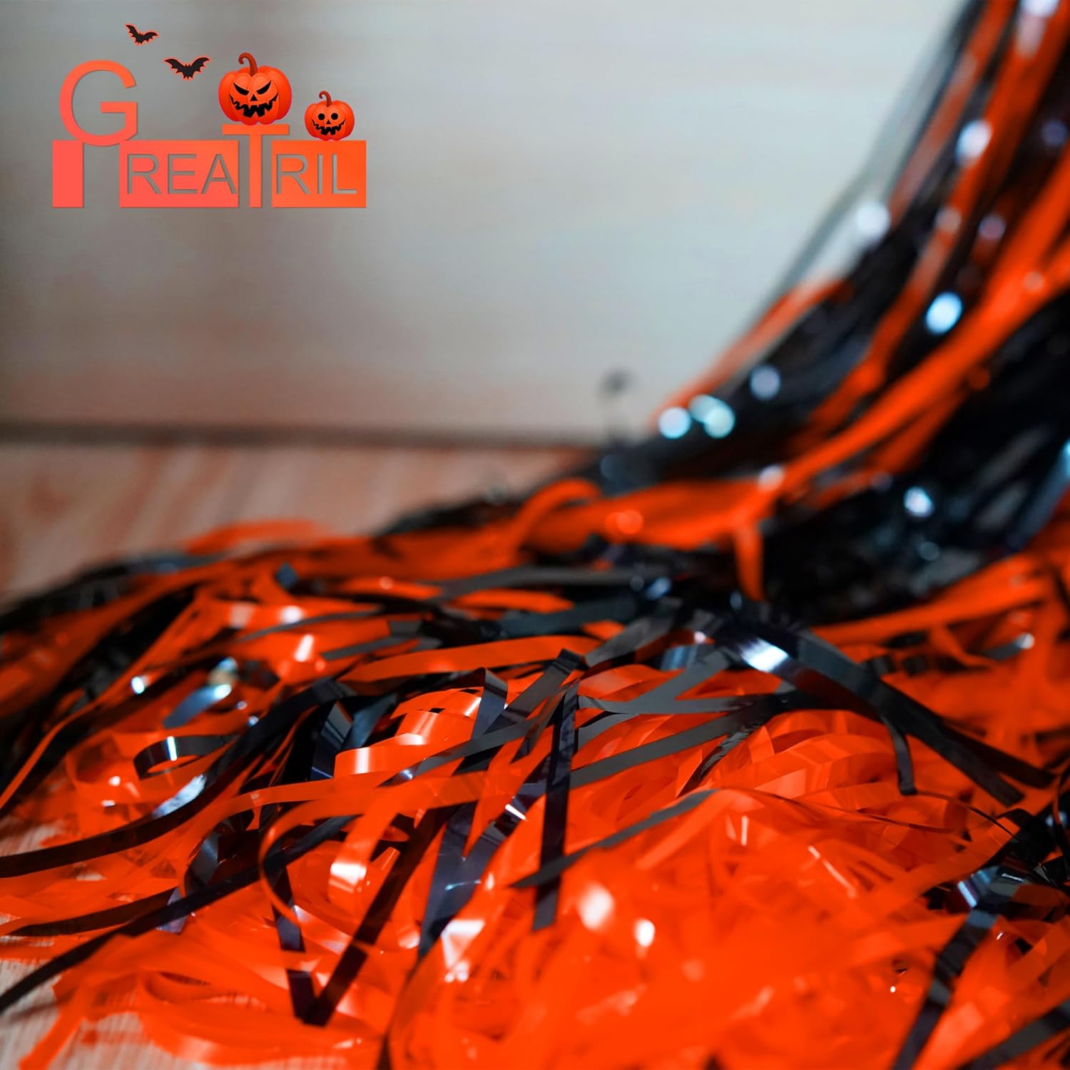 Black Orange Streamers Party Backdrop - GREATRIL Tinsel Fringe Curtain for Halloween Decorations/Pumpkin/Birthdays Party Decoration - 3.2ft X 8.2ft - 2 Packs