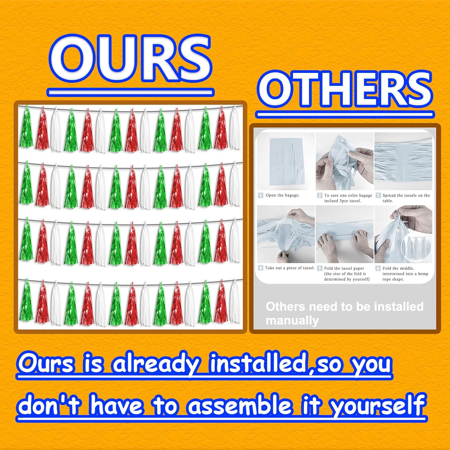 - 【Perfect Party Decoration】The Red Green White tinsel garlands are designed in a metallic Fringe, bright, and beautiful, at the same time, they shine in the sun, and these gorgeous tassel garlands create a wonderful backdrop or centerpiece for your party space. and bring you, your family, and your friend's good Visual effects. your party many emotional and touching moments where a lot of pictures will be taken and everybody will have a wonderful time together.