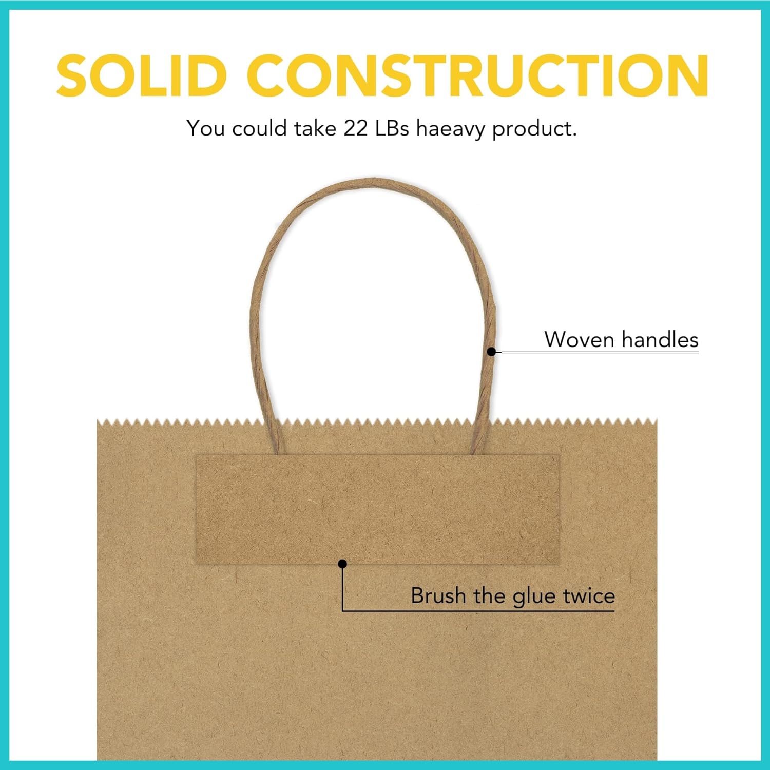 - STURDY AND DURABLE CONSTRUCTION - Halulu brown kraft paper gift bags have a square bottom and can stand up easily. Each bag is several mil. thick and will not tear or rip easily. These kraft paper bags can hold up to several lbs each. The reinforced bottom also provides extra support while you shop or carry items, ensuring that the contents will stay safe not fall through, unlike other flimsy bags. The strong braided handles give an upscale feel while making it easy to carry.