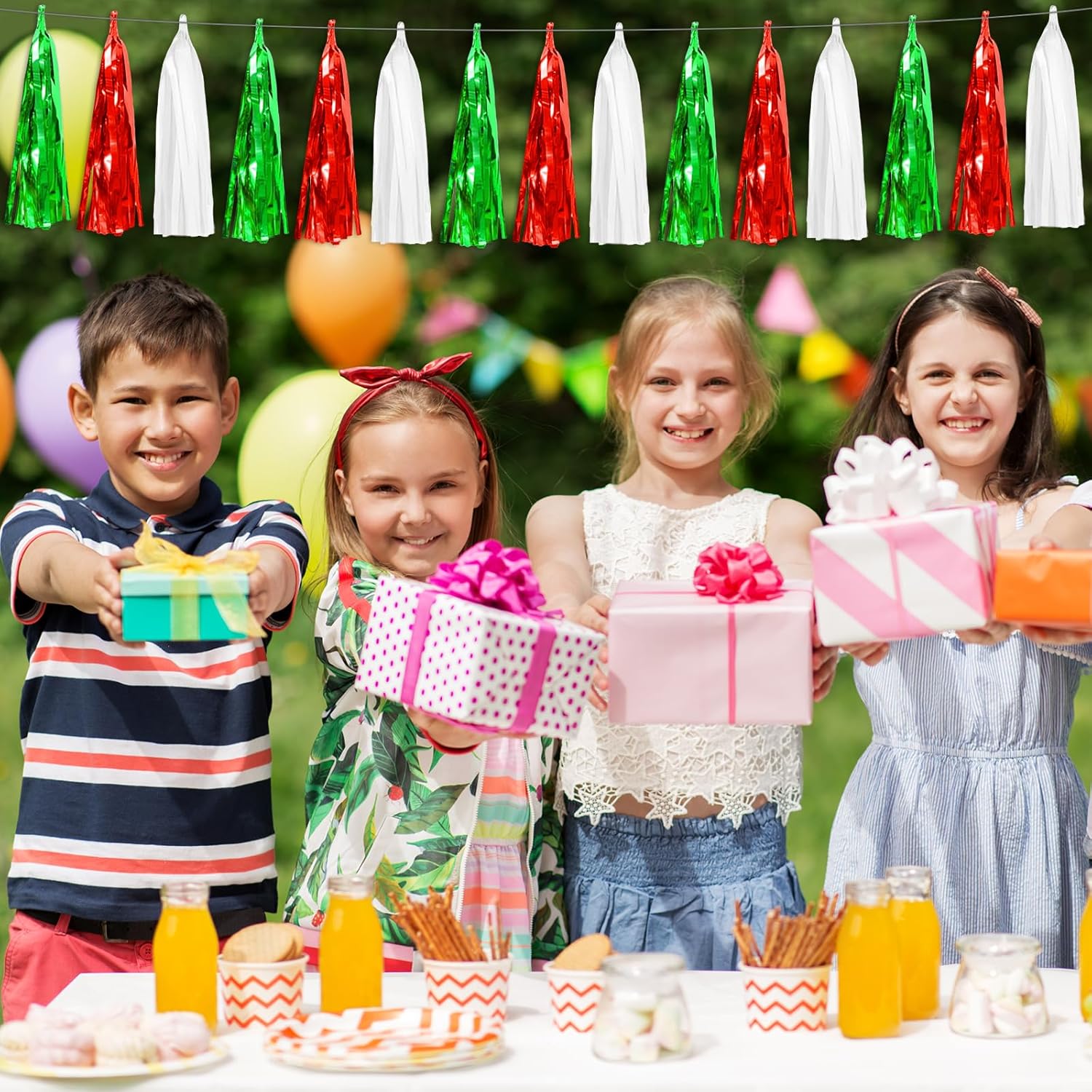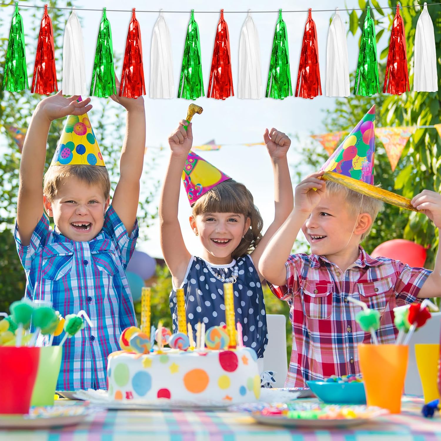 - 【Red Green White Party Supplies Set】: The total length of the Red Green White birthday tassels banner is 78.7 feet, divided into 8 strips, each 9.8 feet long. Each banner contains 15 tassels, and each tassel measures 14 inches, for birthday decorations many occasions, and so on