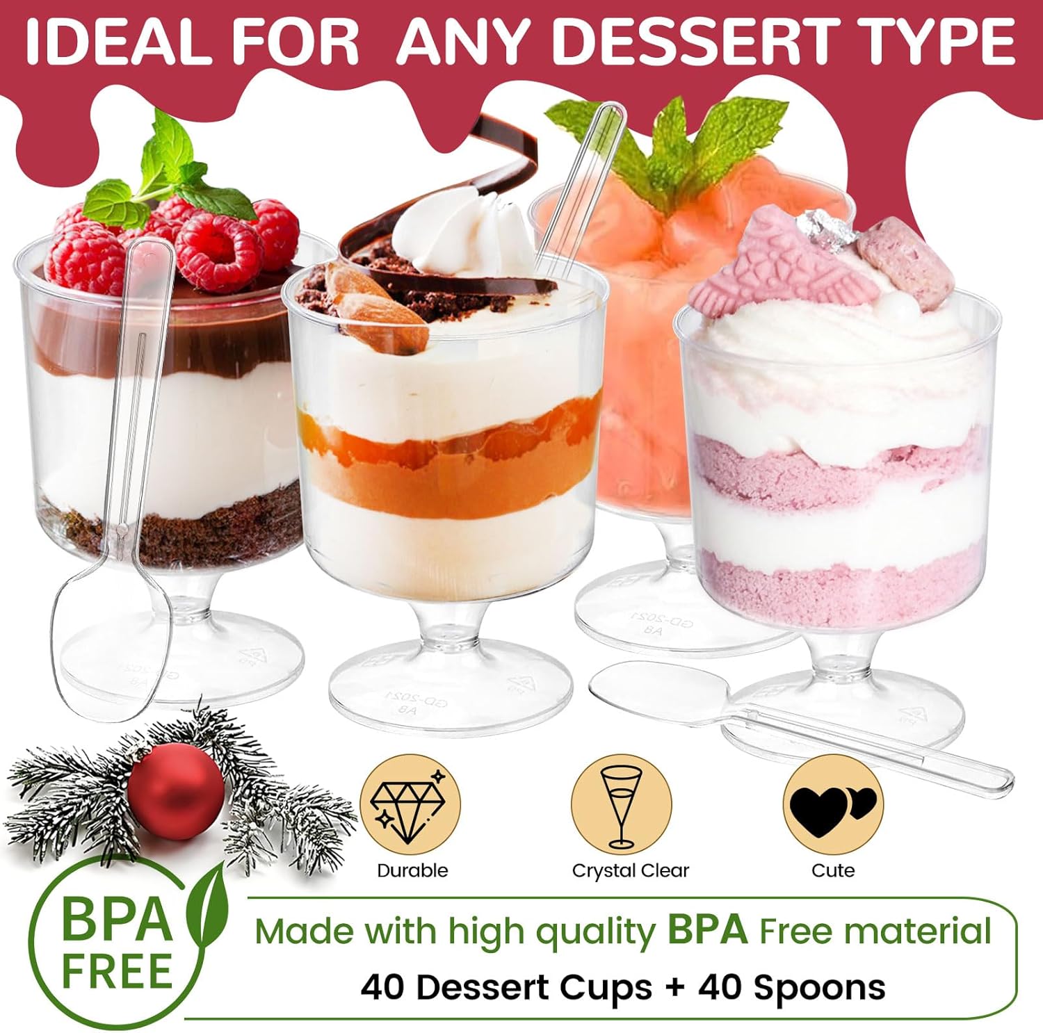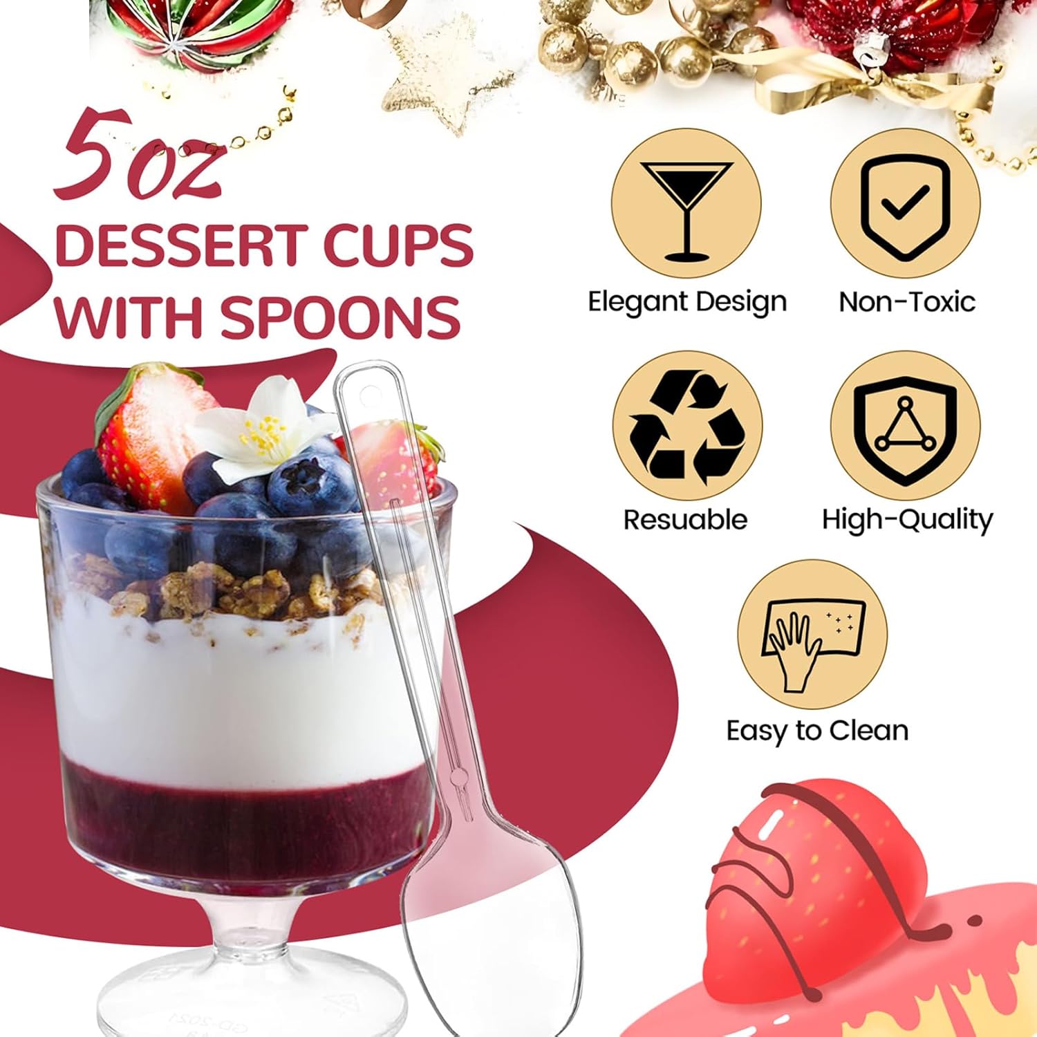 - GREAT VALUE PACK: The package consists of 40 5oz dessert cups, and 50 spoons. There are a total of 80 accessories inside the packaging, making it an ideal choice to meet your diverse needs for gatherings, events, restaurants, and more.(Please check images for exact dimensions)