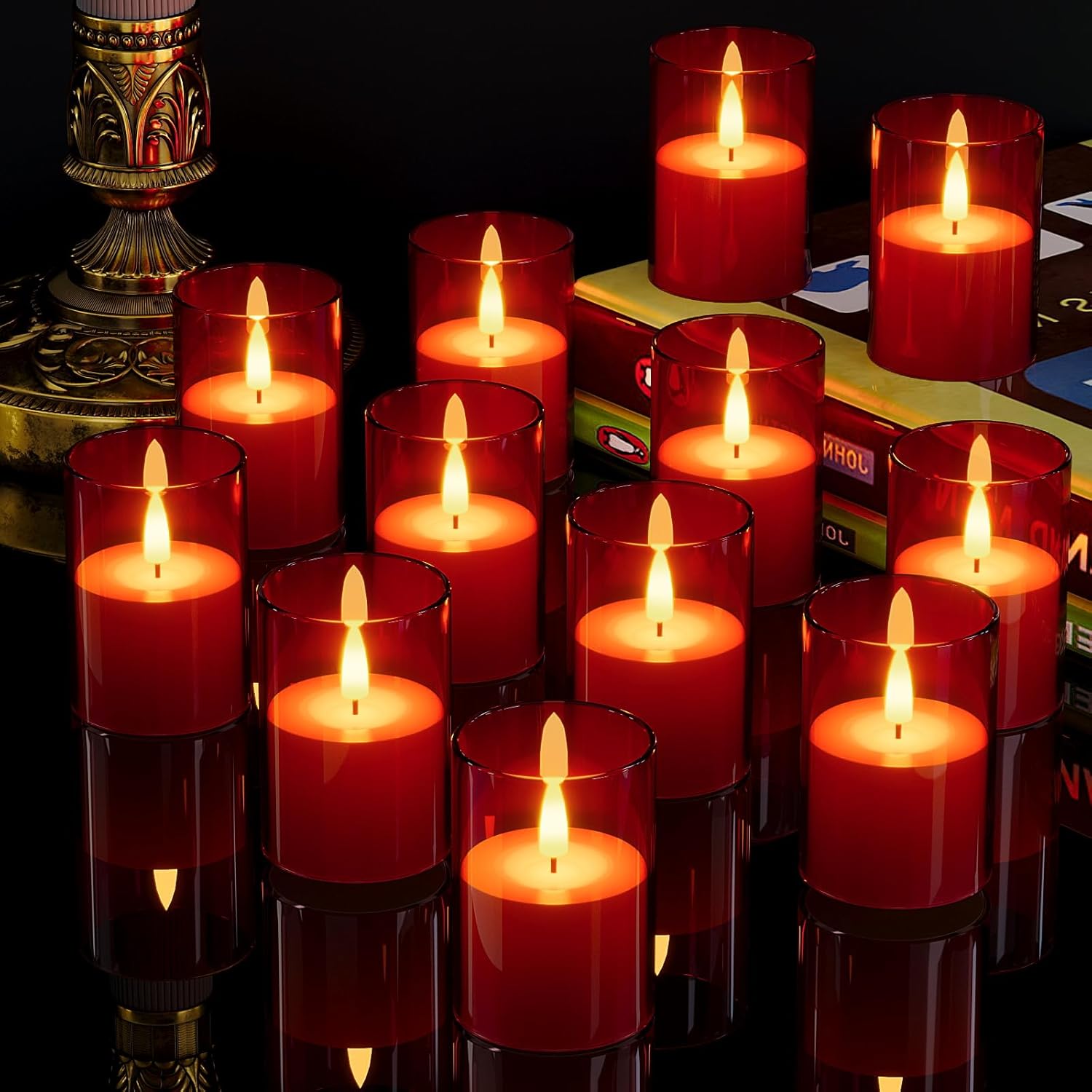 12Pack Flickering Flameless LED Candles with Timer, Battery Powered - Small Pillar & Votive, Red (2"X3")