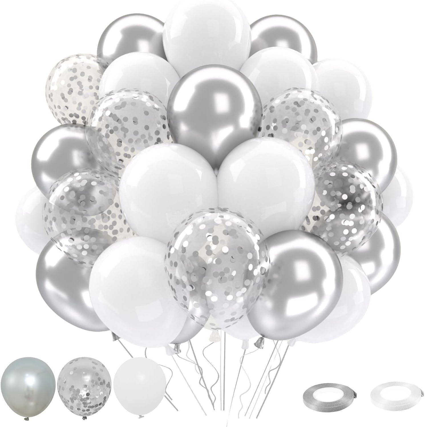 - Package Include: Our white and silver balloons kit includes 20 pcs metallic silver balloons, 20 pcs white balloons, 10 pcs silver confetti balloons, 1 silver ribbon and 1 white ribbon
