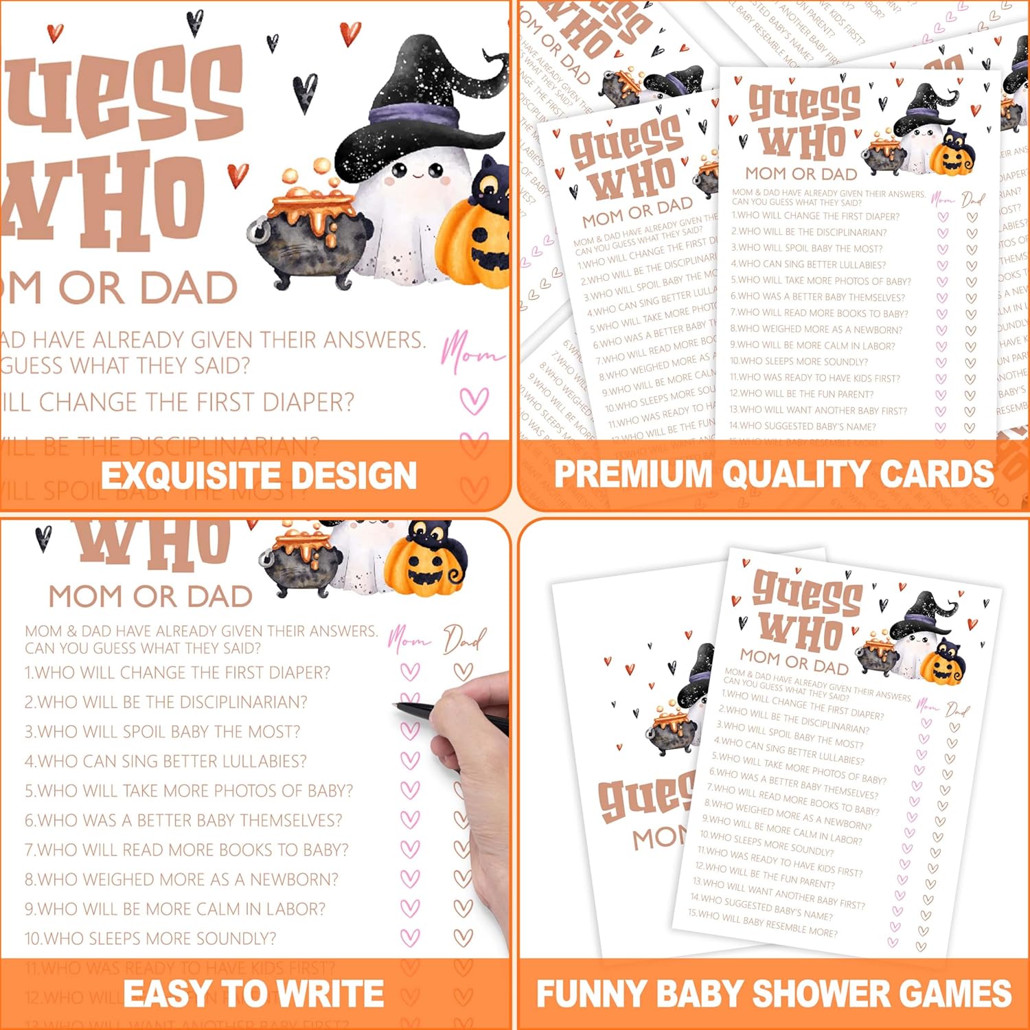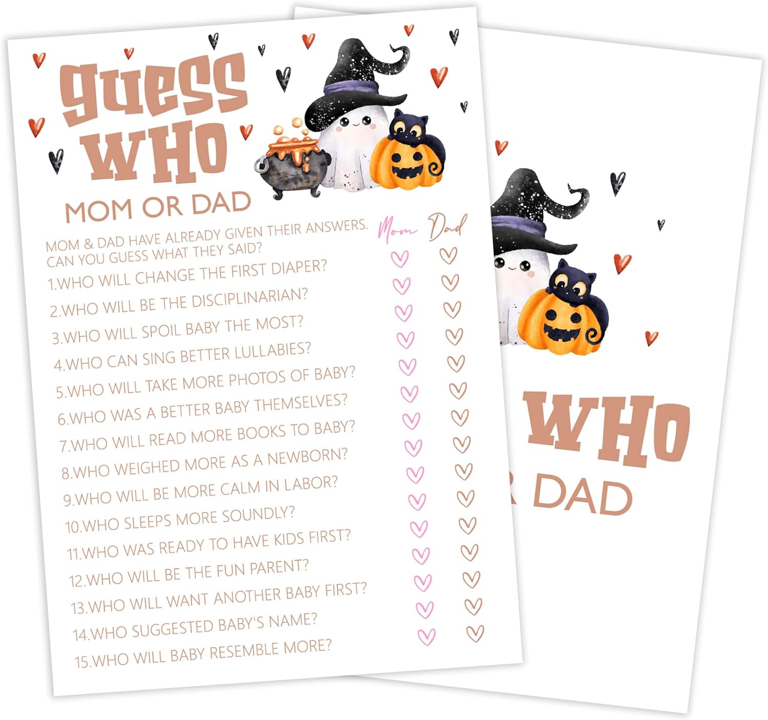 Baby Shower Games, Halloween Guess Who Mom or Dad, 25 Double-Sided Game Cards for Gender Reveal Party Decorations Supplies Announcement - B01