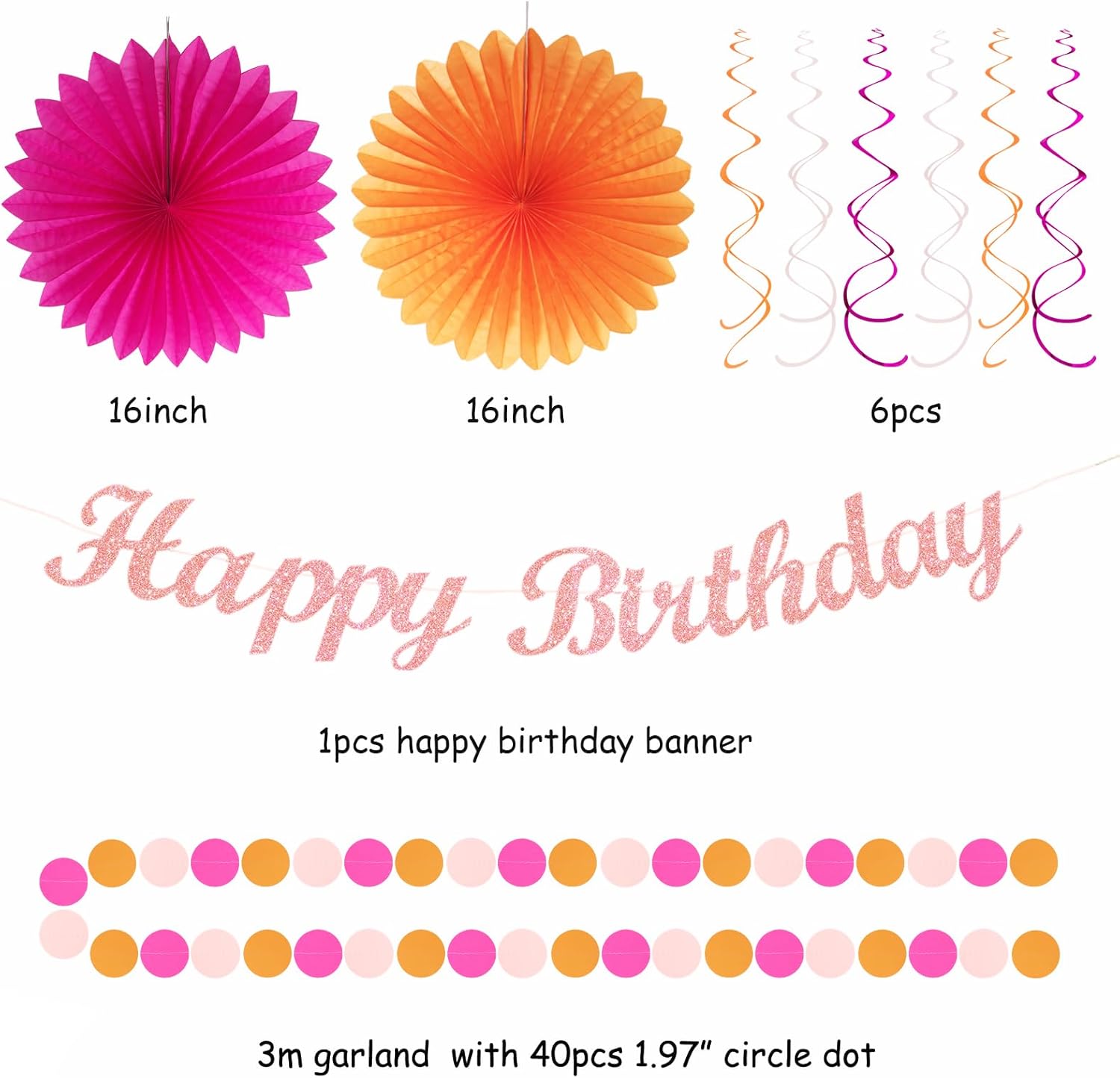 - 【Hot Pink Orange Fall Birthday kits】This kits include 1pcs happy birthday banner, 1pcs circle dots paper banner, 4pcs tissue pom poms: 3pcs 10" and 1pcs 12" , 3pcs 8inch paper honeycom ball, 2pcs 8inch paper lantern, 4pcs 12inch paper flower fan, 6pcs Paper swirls hanging streamers