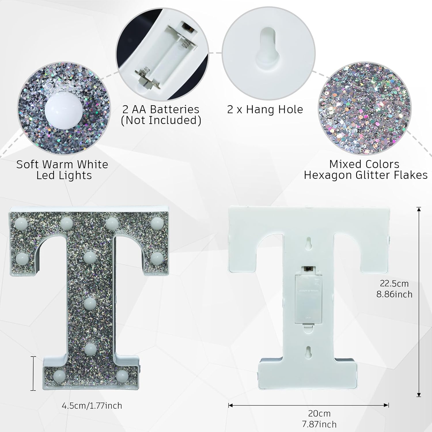 - 💡 Elegant Glitter Light-Up Letters with Silver Diamond Finish: These LED marquee light up letters feature a stunning glitter effect combined with a sophisticated silver diamond surface. Including all 26 alphabet letters and 10 numbers, these light up letters bring sparkle and elegance to any space, making them the perfect light letters for party decor, especially as light up letters for table settings or wall accents.